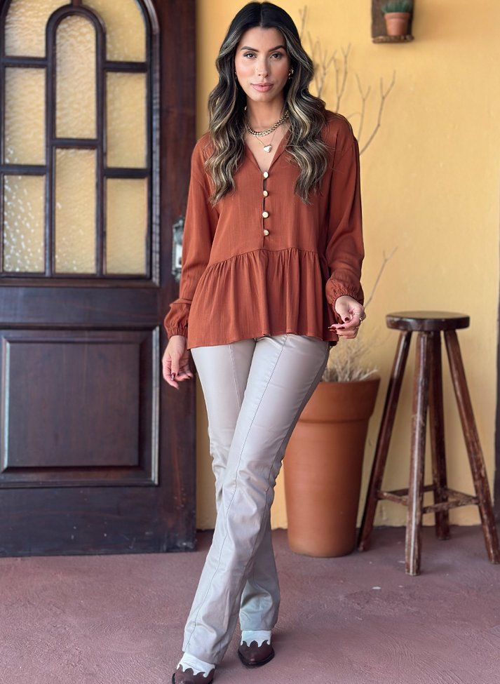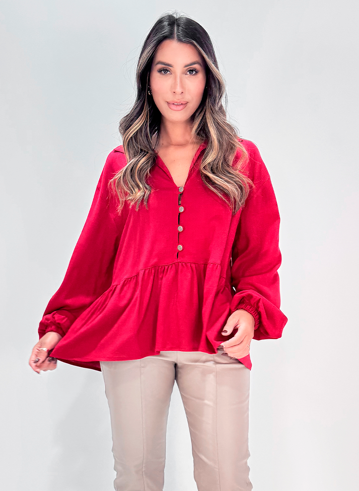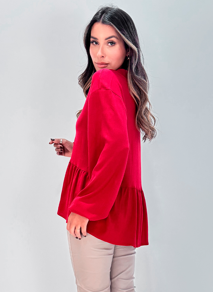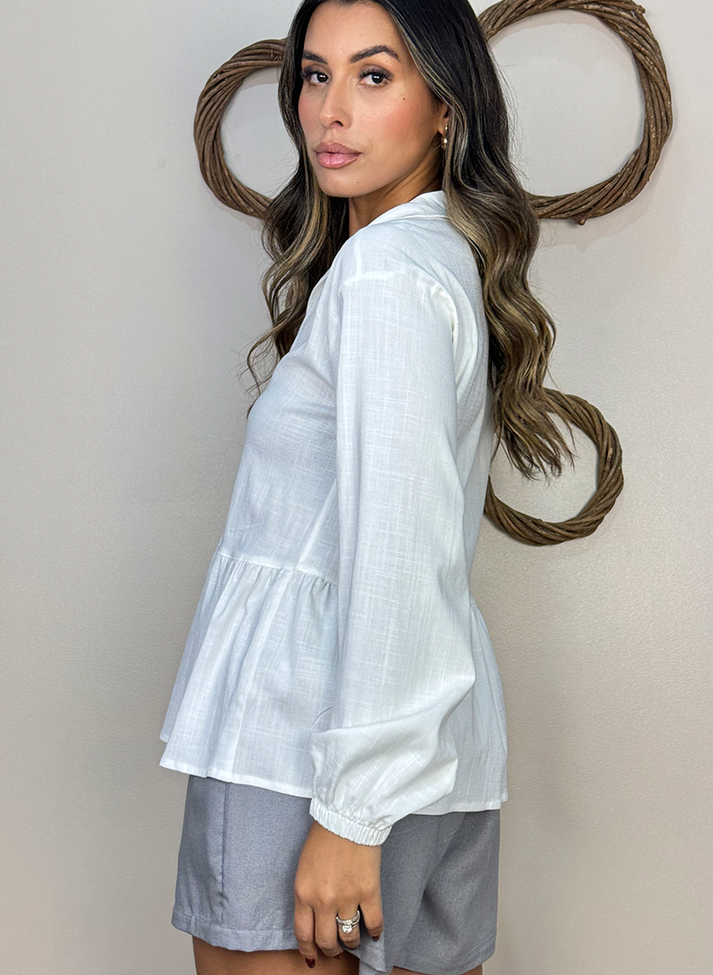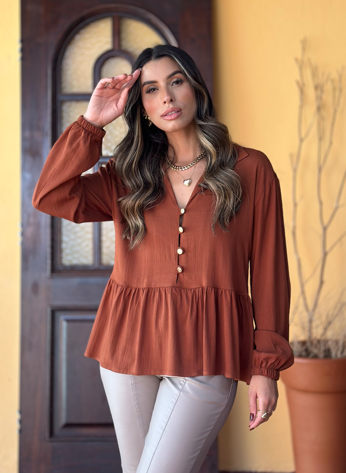 Blusa bata em viscose com elastano, tecido liso com caimento leve e toque macio. Com modelagem mais solta, possui cavas deslocadas e mangas longas em punho bufante com elástico. Com gola simples sem pé de gola e vista até recorte com casinhas em argolas. Contém peplum em recorte franzido trazendo volume e movimento a peça. O design remete a uma estética retro evocando o estilo boho com seus detalhes e modelagem mais ampla.