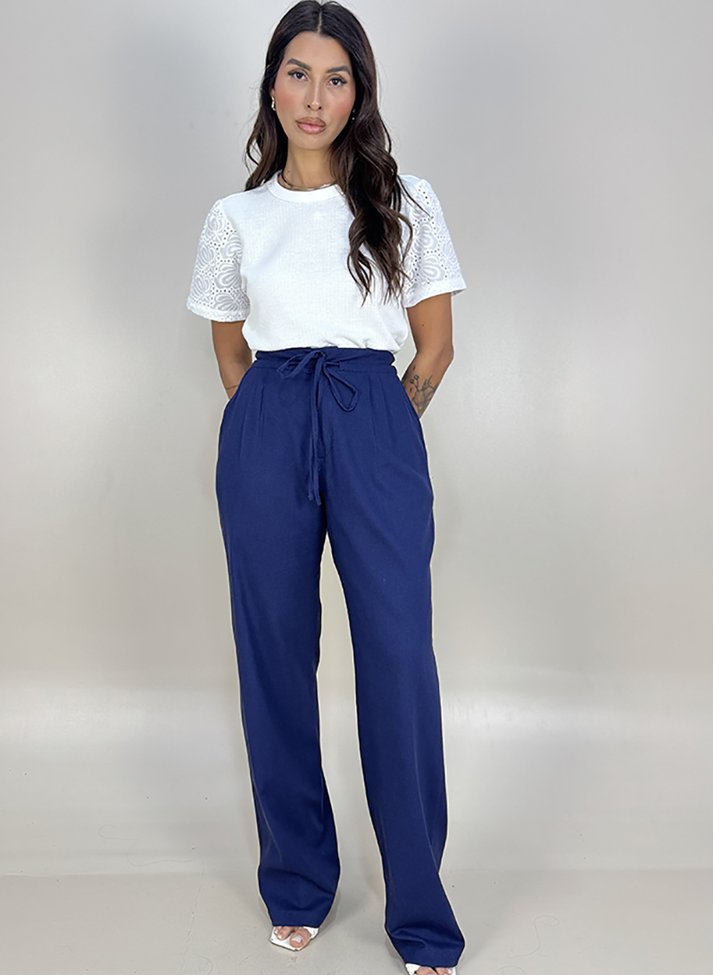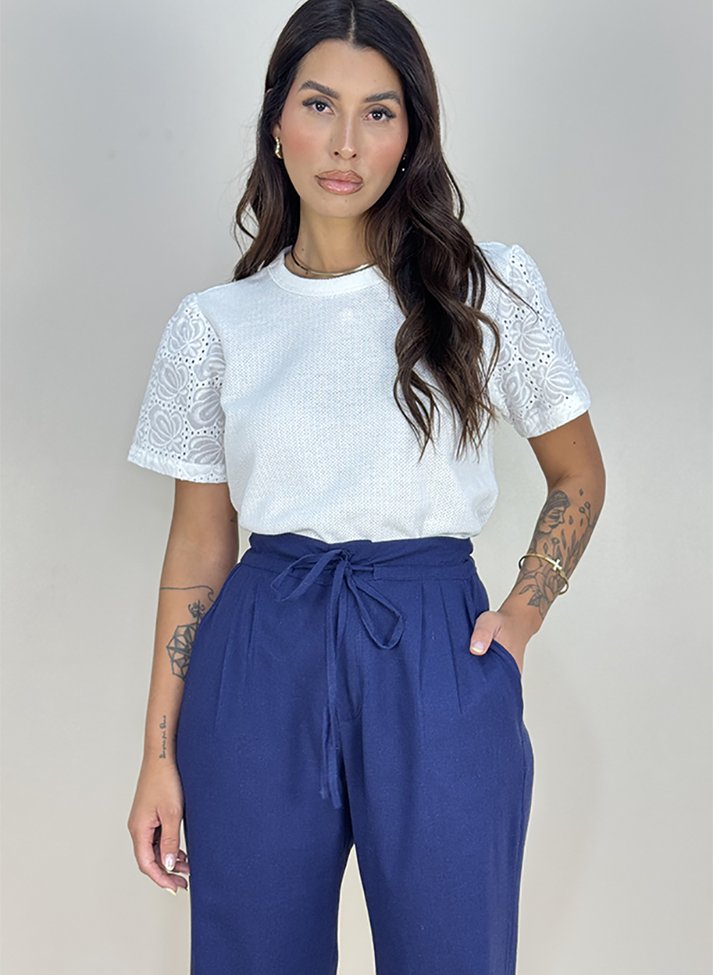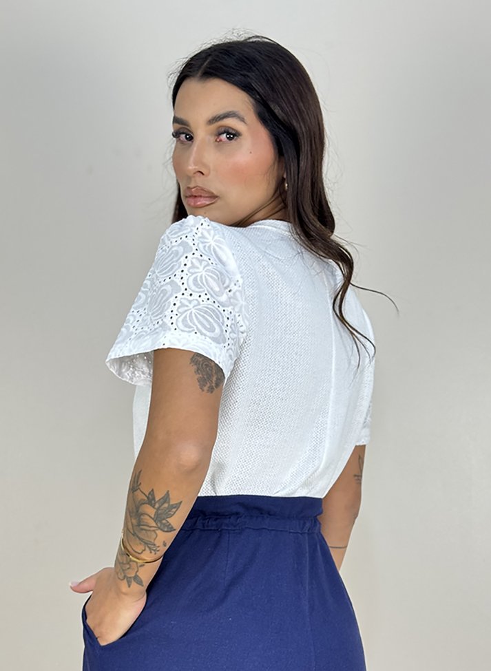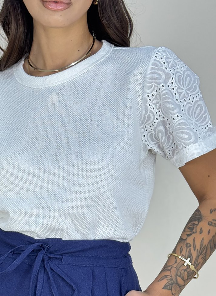 Blusa em malha mista com algodão, poliéster e elastano, proporcionando boa elasticidade, resistência e toque macio. Possui corte acinturado, com decote redondo com acabamento em viés. As mangas curtas franzidas em laise evocam sofisticação e romantismo.