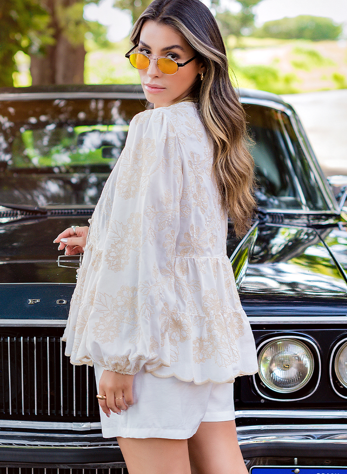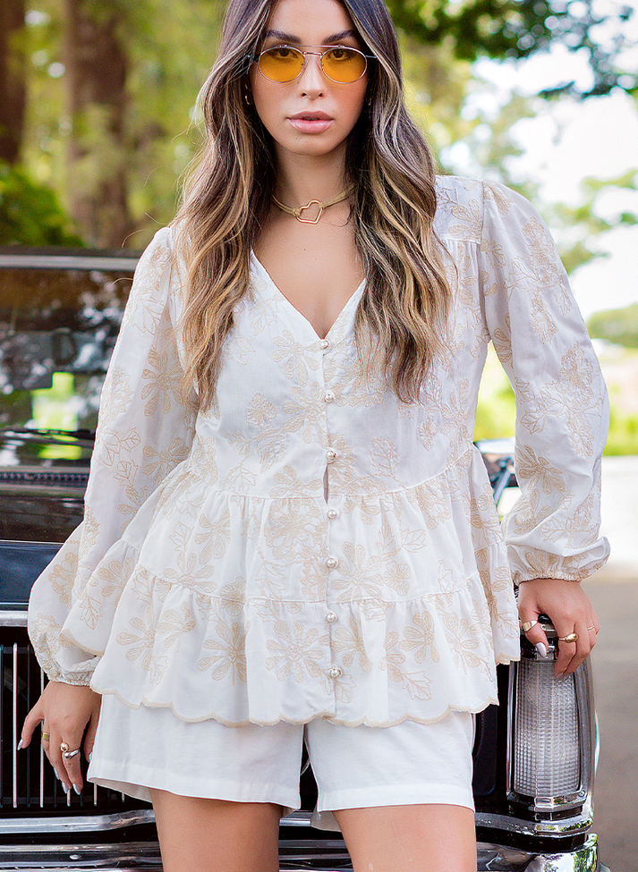 Blusa bata em tecido de algodão bordado, tecido com aspecto de fibras naturais que evoca feminilidade, romantismo e remete ao manual e a natureza. Com modelagem mais solta, possui pala frontal com franzido gerando volume a peça. A manga longa traz um volume levemente bufante com franzido na cava e punhos em elástico. Abaixo da cintura alta a peça segue em recortes franzidos formando barra em babado e criando volume semelhante ao peplum. Com decote em “V” e abertura em vista com argolas evocando delicadeza e trazendo um toque vintage.
