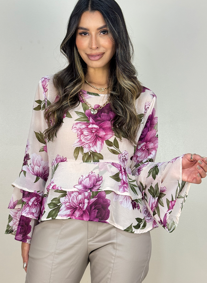 Blusa em crepe estampado em maxi floral, tecido com caimento leve e fluidez. Seu design evoca romantismo com babados e cores femininas. Possui modelagem mais solta com recorte arredondado na altura da cintura trazendo dois babados sobrepostos. Com gola redonda e mangas volumosas com três babados godê sobrepostos.