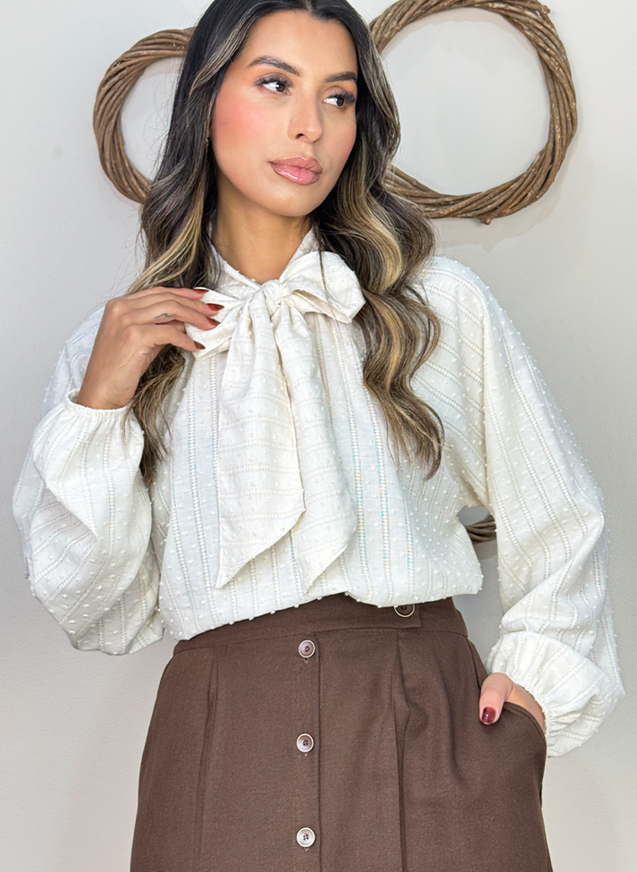 Blusa de manga longa em tecido jacquard com maquinetado formando listras e poá texturizado. Tecido composto por fibras naturais trazendo o aspecto das fibras, toque macio e caimento leve. Seu design remete ao vintage e ao romantismo feminino. Possui gola alta com amarração formando laço sendo o detalhe chave da peça, trazendo charme e delicadeza. As mangas raglan trazem um corte mais despojado, proporcionando caimento e leveza aos ombros. Com franzido na gola trazendo volume e punhos levemente bufantes com elástico fino.