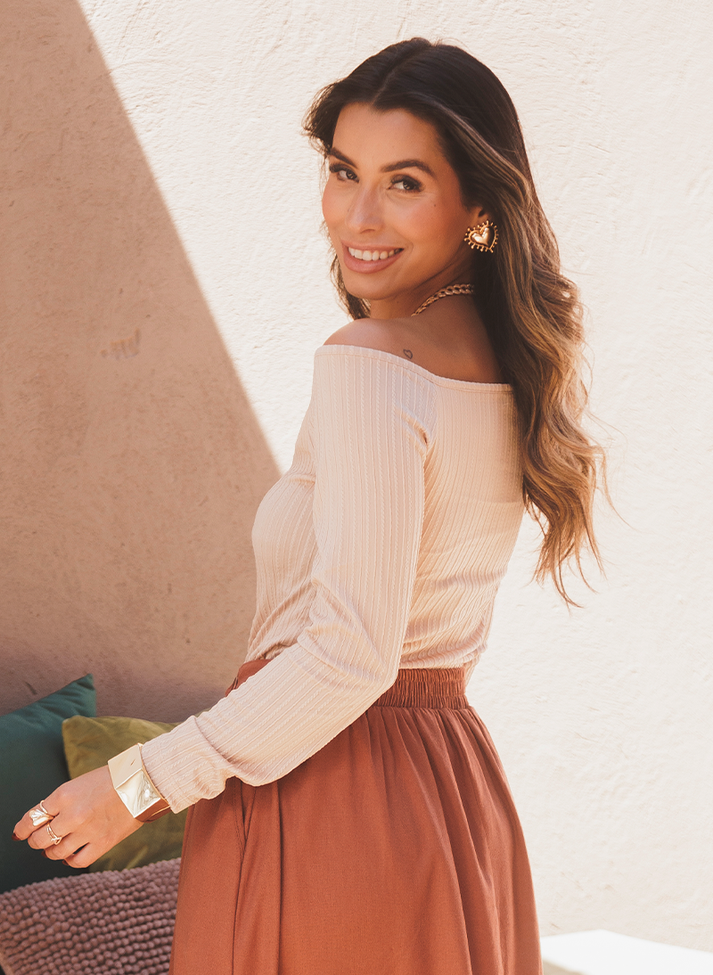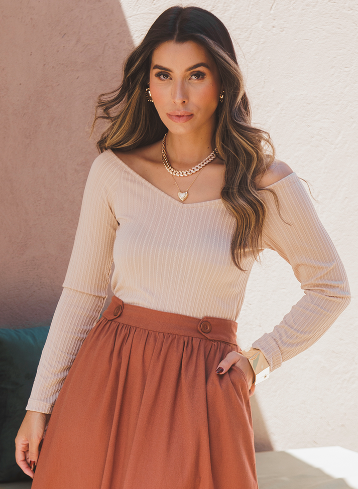 Blusa de mangas em tricozinho texturizado com padrão de listras, malha com toque macio e conforto térmico. Com decote em “V” ombro a ombro traz uma estética feminina e romântica. Sua modelagem mais ajustada permite versatilidade, podendo ser uma peça “segunda pele” na composição de looks com mais camadas, ou uma peça essencial que agrega romantismo em looks com duas peças.