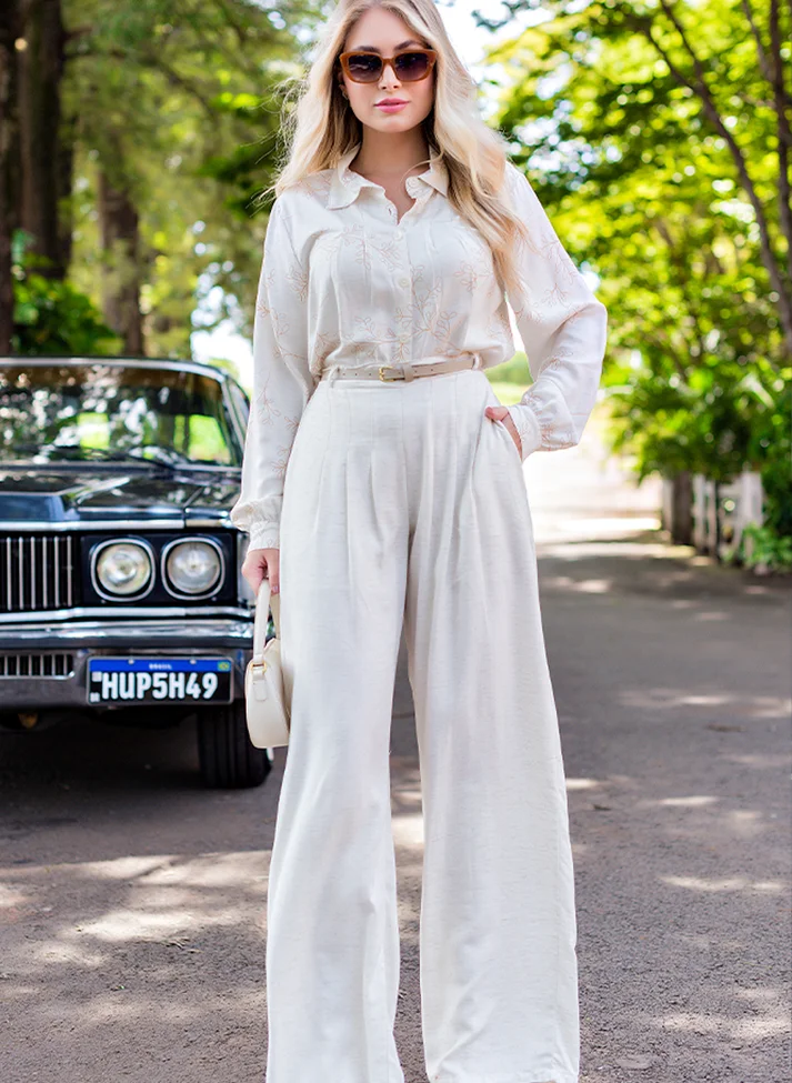 Possui forro, que traz mais conforto e melhor vestibilidade a peça. O volume criado pela modelagem pantalona em formato evasê, ganha mais destaque com as seis pregas frontais que ajustam o volume a cintura, aumentando o volume no quadril, e formam um detalhe único em padrão vertical que ajudam a alongar a silhueta. O cós reto com passantes possui elástico nas costas, trazendo melhor vestibilidade. Os bolsos facas são um detalhe tradicional e utilitário que trazem praticidade para a peça workwear.