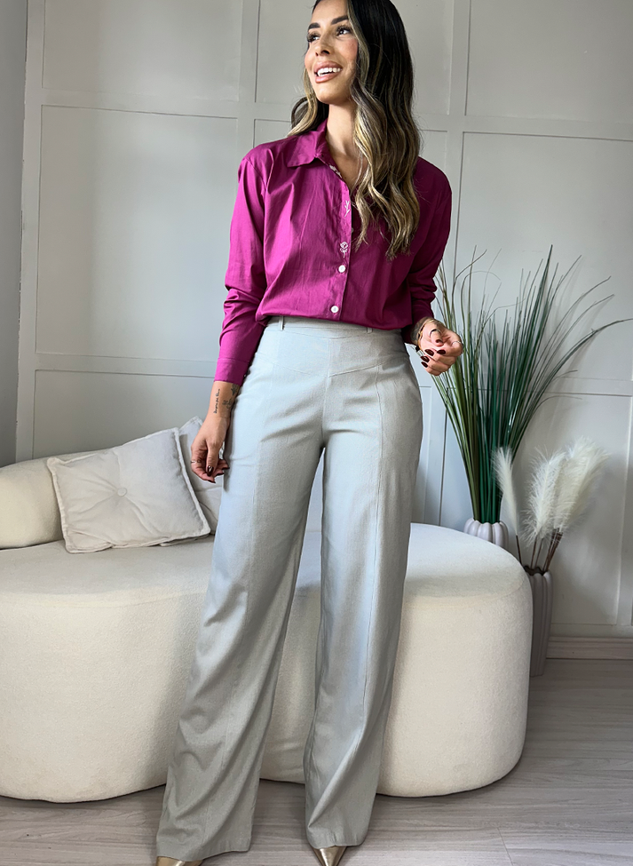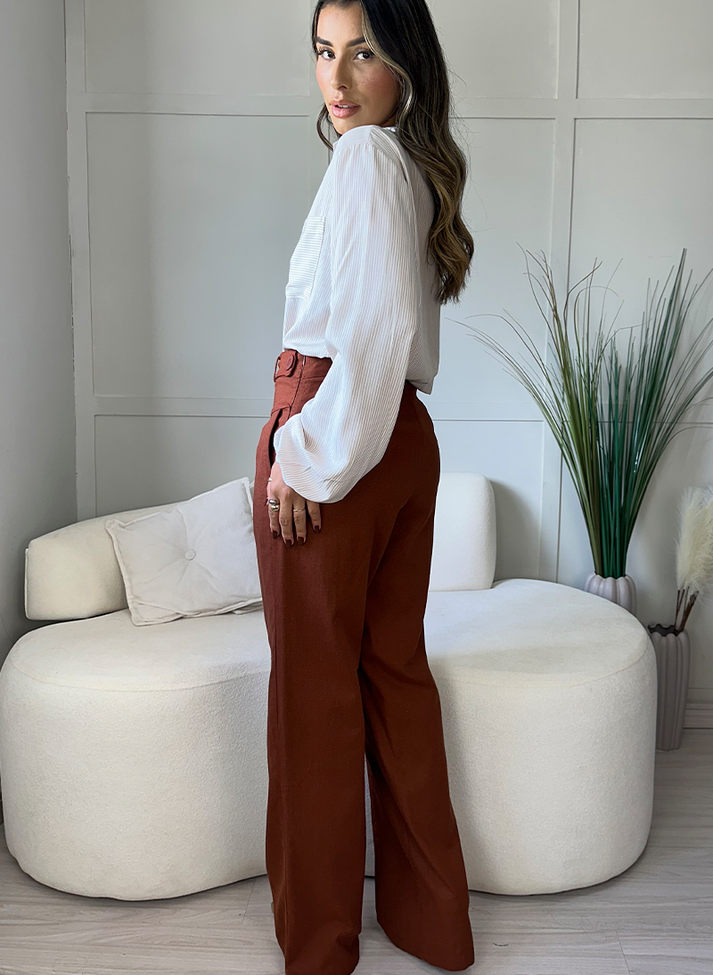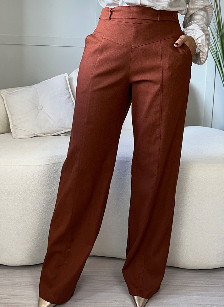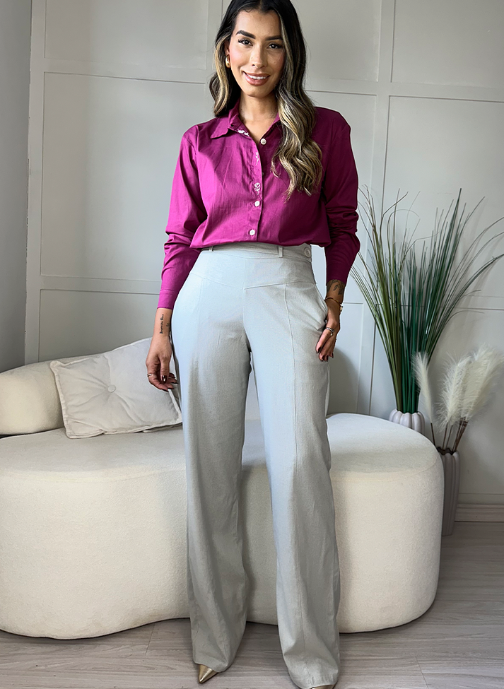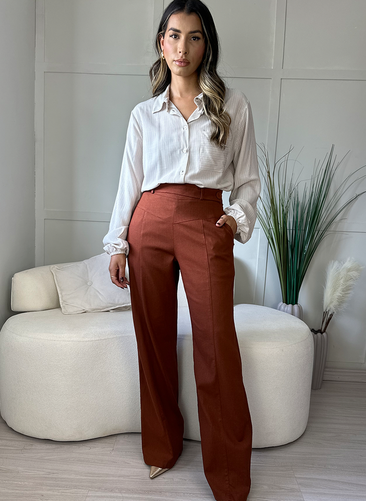 Calça pantalona em linho misto com lycra, tecido com aspecto rústico do linho, caimento leve, toque macio e elasticidade. Possui modelagem mais ampla, com abertura em zíper na lateral. O cós contém transpasse ornamental com botão na lateral e passantes. Abaixo do cós um recorte frontal em “V” mais ajustado desenha a cintura. A peça segue com recortes verticais em linha princesa. Contém bolsos faca abaixo do recorte.