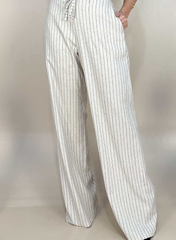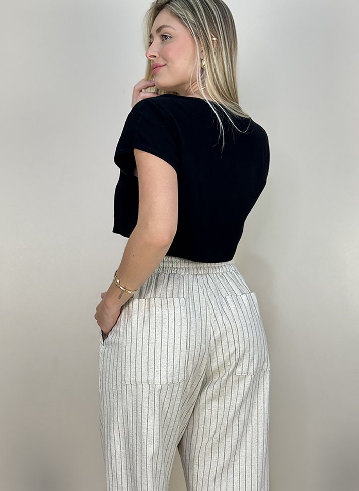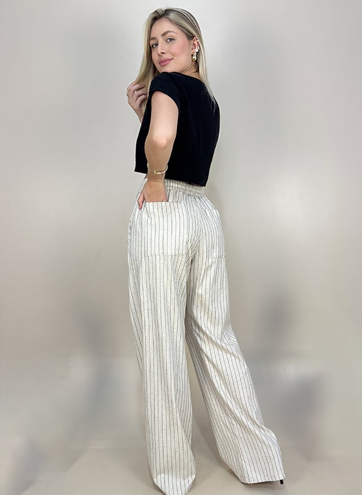 Calça em linho misto com elastano, tecido com boa elasticidade, aspecto rústico, caimento leve e toque macio. A estampa listrada e o corte pantalona alonga a silhueta. Possui cós com elástico nas costas, rolete ornamental, bolsos faca e bolsos externos nas costas. Contém forro.