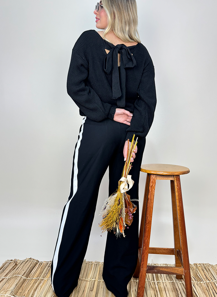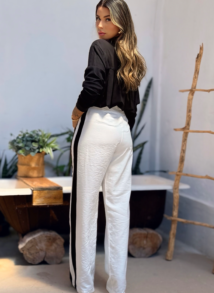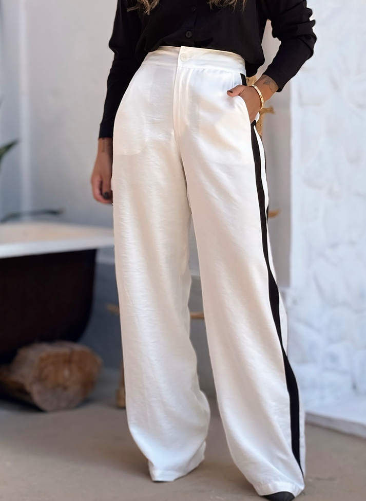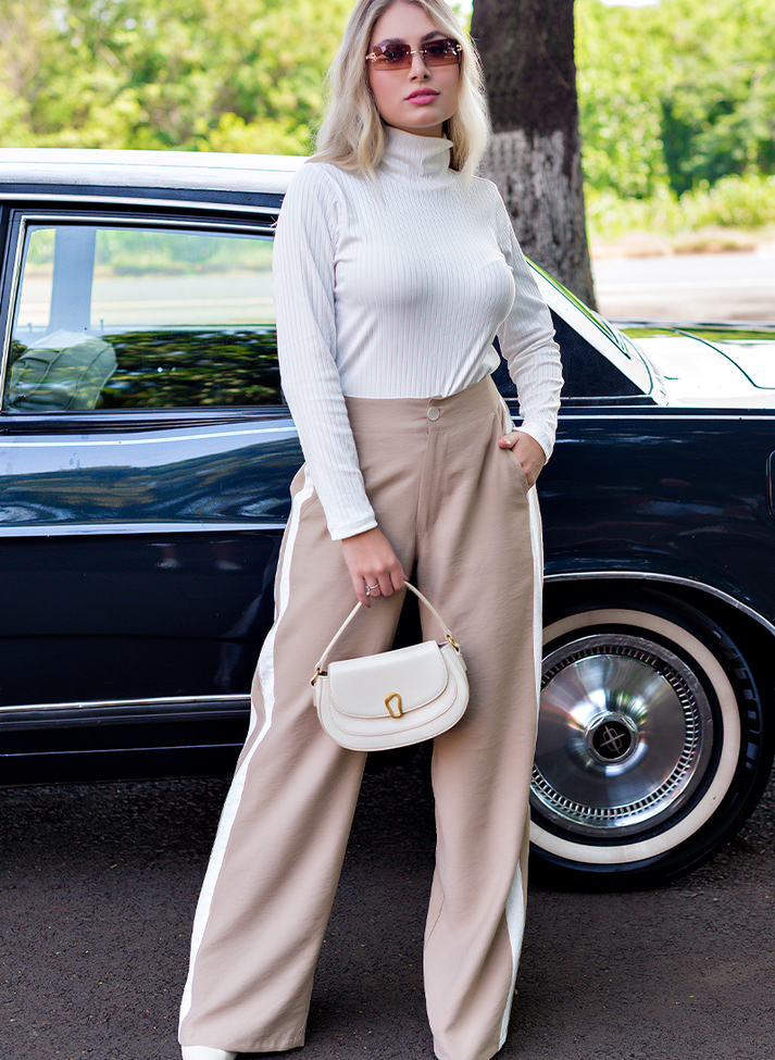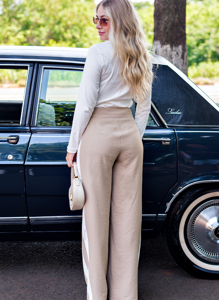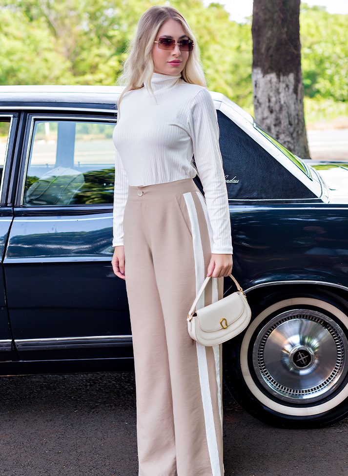 Calça em viscose, tecido com caimento leve e toque macio. Seu desenho mais ajustado na parte superior traz sofisticação e um “shape” mais estruturado. Seguindo modelo wide leg com modelagem mais larga em evasê, possui cós anatômico com abertura em braguilha, bolsos faca e faixas laterais em sentido vertical que ajudam a alongar e desenhar a silhueta.