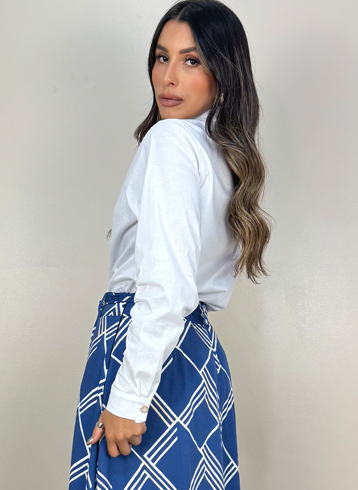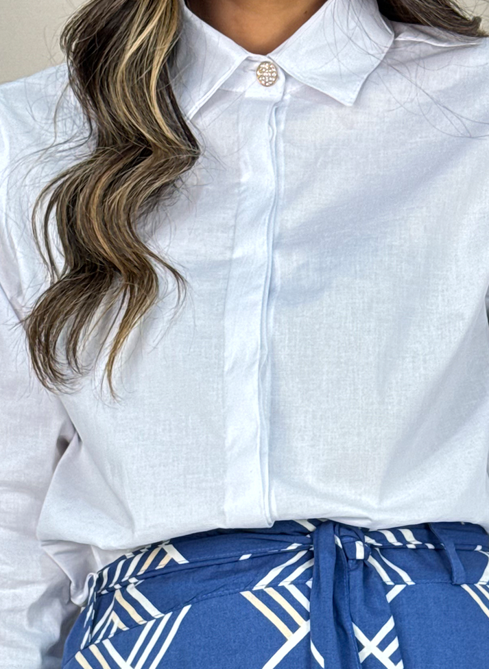 Camisa em tricoline de algodão, tecido com caimento levemente encorpado e toque macio. Seguindo modelagem mais tradicional de camisaria feminina, possui o corte mais ajustado e acinturado, com colarinho tradicional, mangas longas e punho com duas pregas. A vista é coberta trazendo destaque para os botões nos punhos e no pé de gola, pontos de luz na peça com trabalhado em strass, trazendo sofisticação e feminilidade.