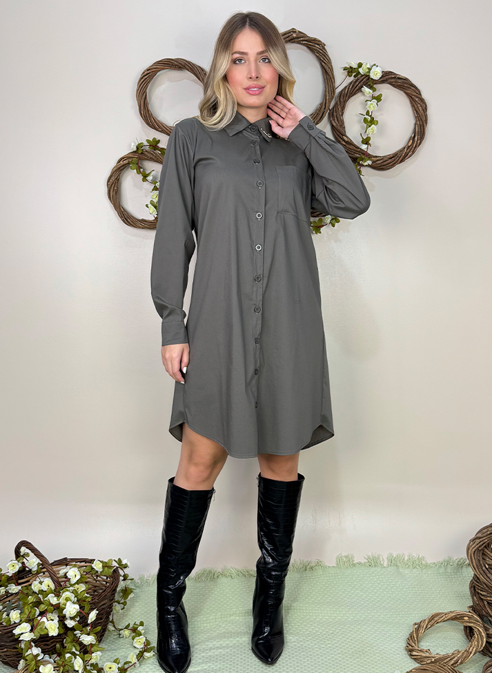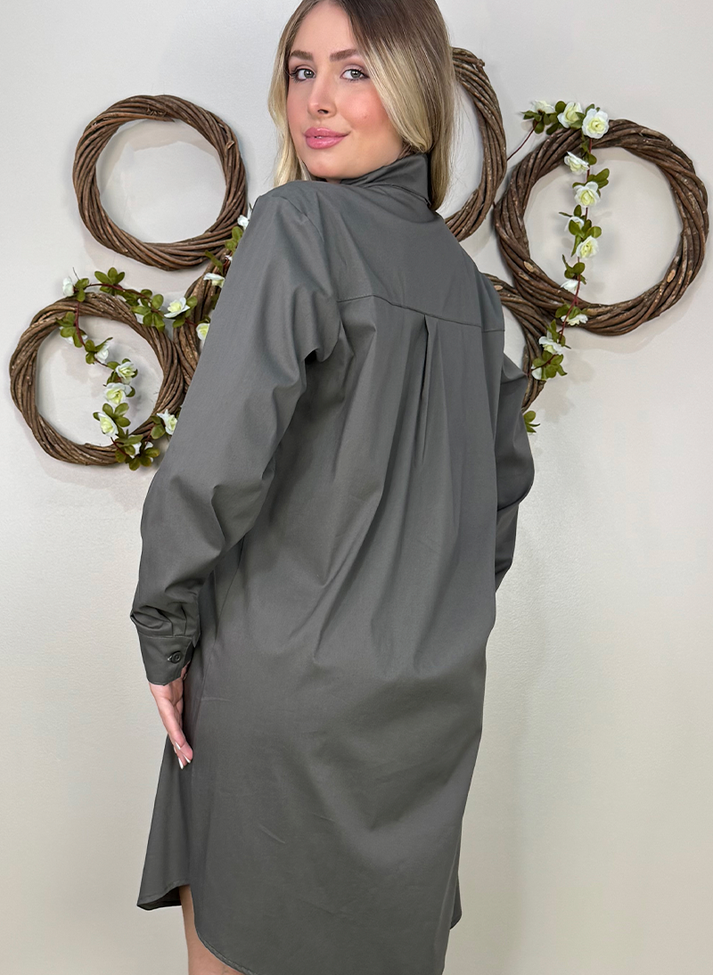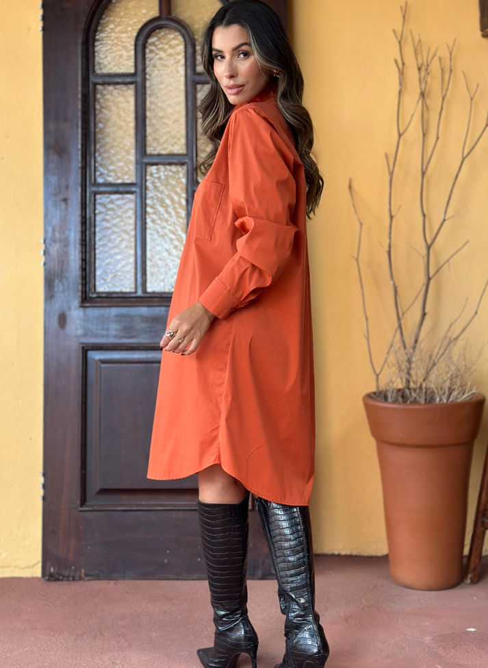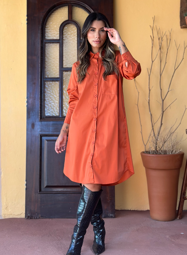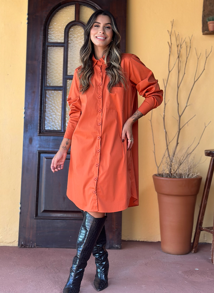 Chemise curta em tricoline, tecido tradicional da camisaria, com caimento levemente estruturado e toque macio. Possui elementos tradicionais como colarinho, punho com botões, barra arredondada, pala e pega nas costas, evocando uma estética clássica, sofisticada com toques de romantismo agregado com detalhes. Seu corte mais volumoso traz um desenho levemente acinturado, com bolso externo quadrado em busto. Acompanha um broche de corações.