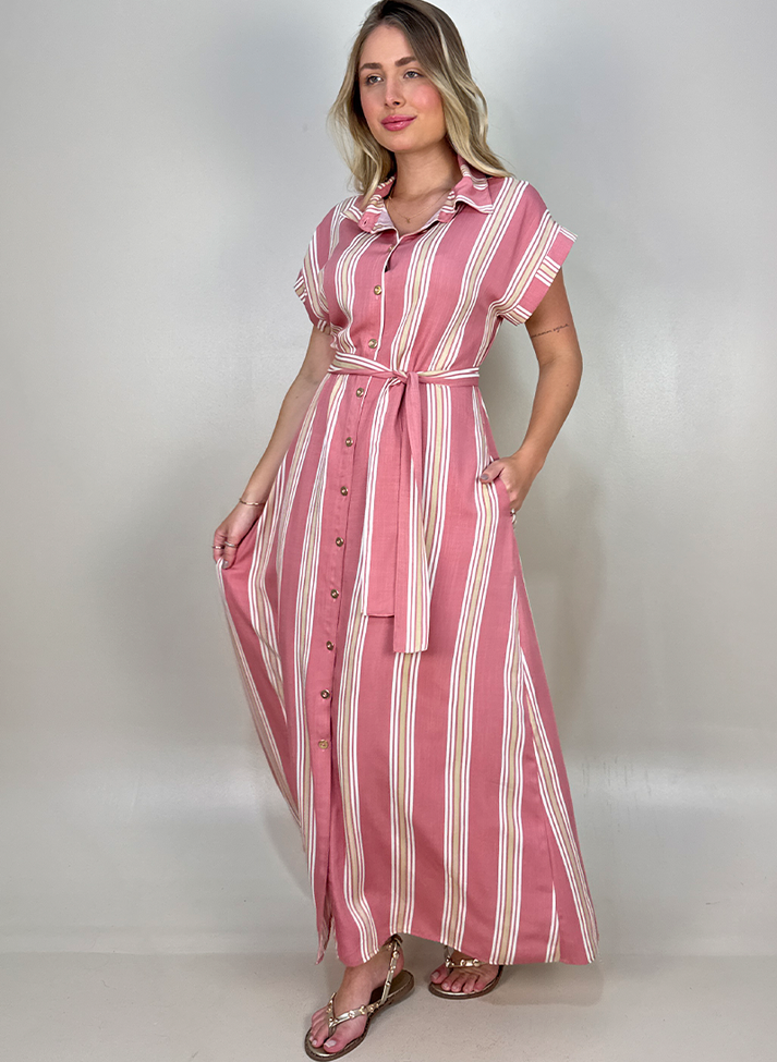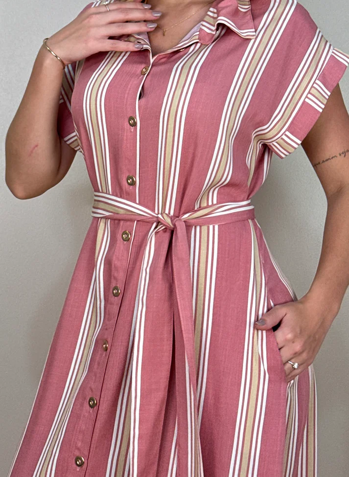 Chemise em viscose listrada, tecido com caimento leve e toque macio. A peça traz a estampa clássica do verão com corte soltinho levemente acinturado em evasê, ajudando a alongar a silhueta. Possui colarinho tradicional, vista simples, mangas muscle com pala dobrada e bolsos laterais. Acompanha uma faixa larga avulsa.