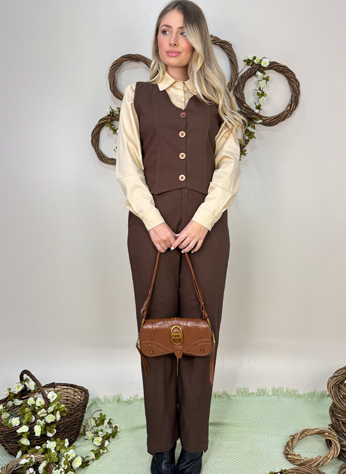 Colete em linho misto com elastano, tecido com aspecto rústico, caimento leve e toque macio. Seguindo design tradicional da alfaiataria, possui modelagem estruturada com leve desenho acinturado. Contém barra em “W”, abotoamento tradicional e recorte em linha princesa, desenhando e alongando a silhueta.