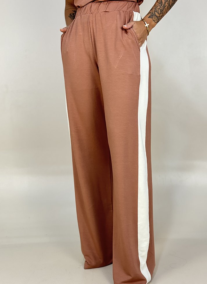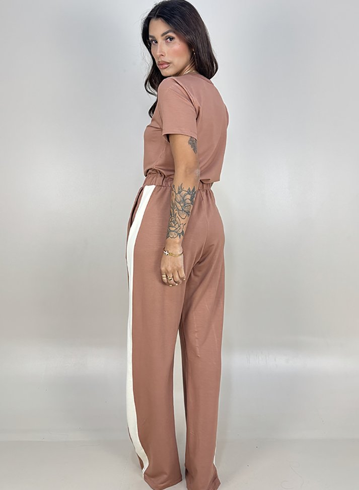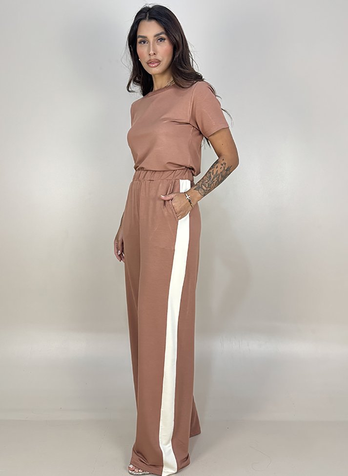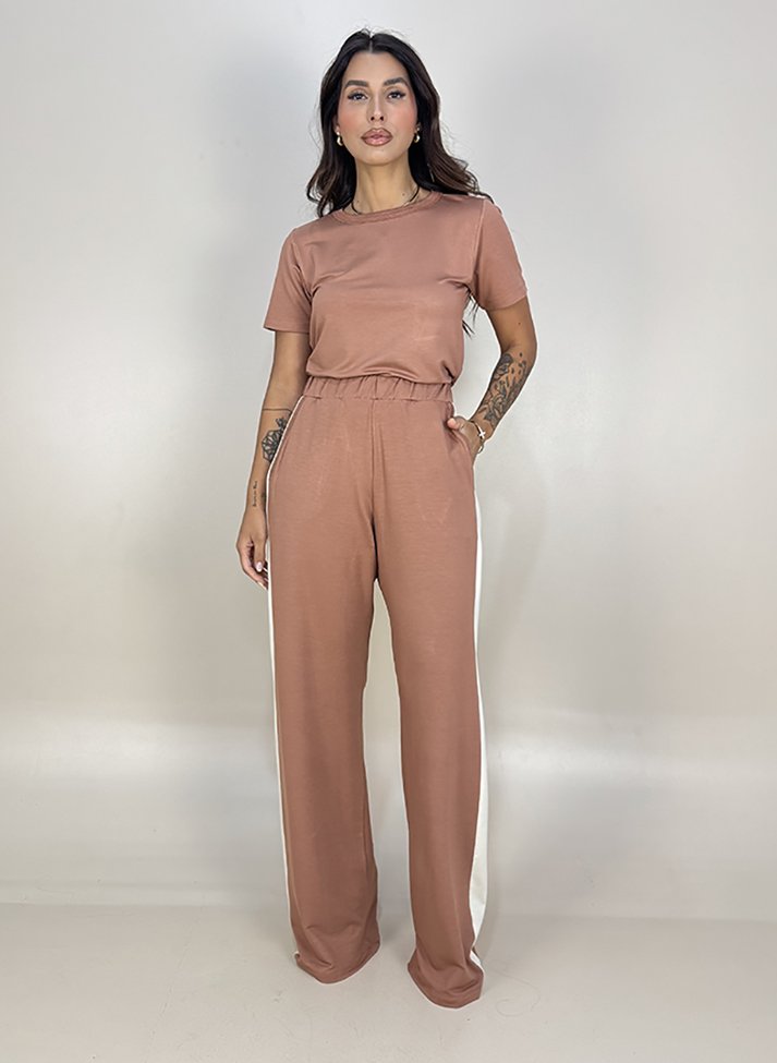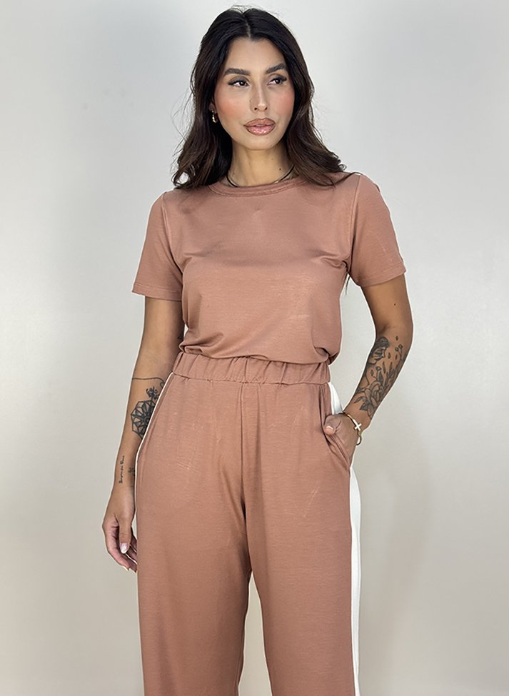 Conjunto em malha de viscose com elastano, proporcionando boa elasticidade caimento leve e toque macio. Composto por cropped e calça traz uma estética inspirada no Sportstyle. O cropped possui modelagem levemente ajustada com gola redonda em segunda cor. A calça wide leg possui cós com elástico embutido, bolsos faca e faixa lateral.