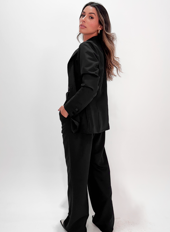 Conjunto alfaiataria em tecido sarjado resistente, com caimento leve e toque macio. Composto por blazer e calça pantalona, seu design é inspirado na alfaiataria feminina contemporânea e na estética workwear. O blazer alongado possui recorte em linha princesa, abertura comum e abotoamento nas mangas. A calça pantalona com modelagem mais ampla, possui abertura em braguilha e passantes largos formados pelo bolso externo. Acompanha um cinto de tecido com argolas em meia lua.