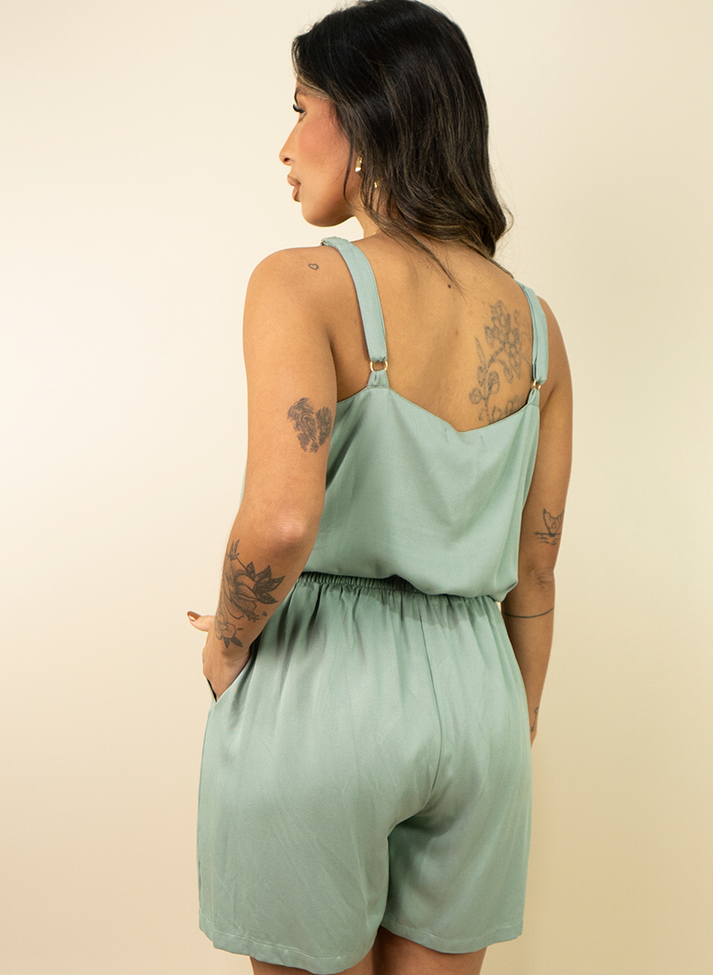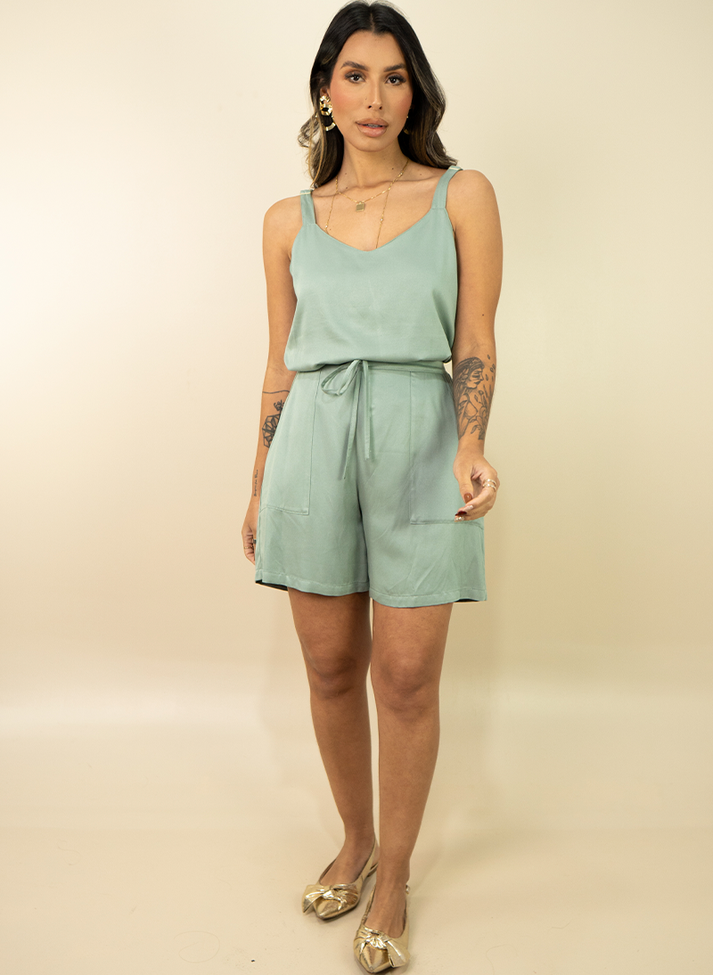 Conjunto em viscose sarjada, tecido com caimento leve e toque macio. Composto por blusa e shorts a composição traz uma estética descontraída e veranil. A blusa de alcinha larga com reguladores contém decote em V e corte acinturado. O shorts forrado, possui cós largo com elástico nas costas, roletê ornamental e bolsos externos.