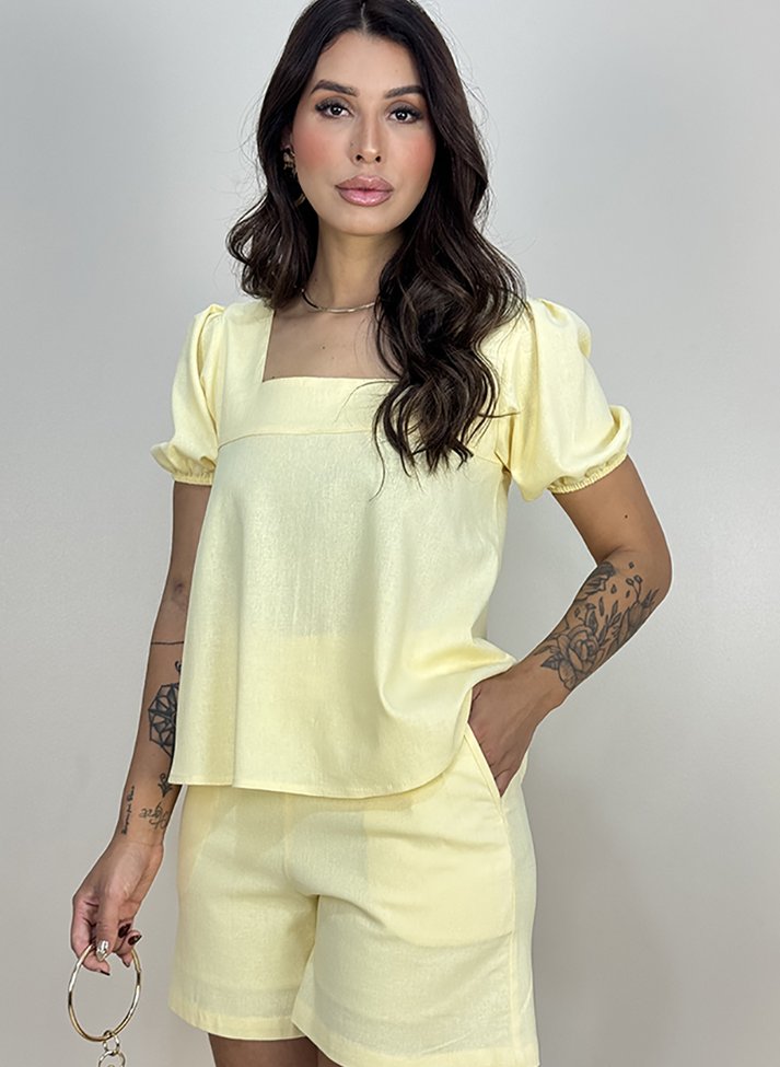 Conjunto em linho misto, tecido com caimento leve, toque macio e aspecto rústico. A composição traz uma estética moderna e veranil, sem perder a essência romântica. A bata possui decote quadrado, mangas bufantes e corte soltinho com leve acinturado. O shorts possui corte também em evasê com forro, abertura em zíper na lateral e bolsos faca.