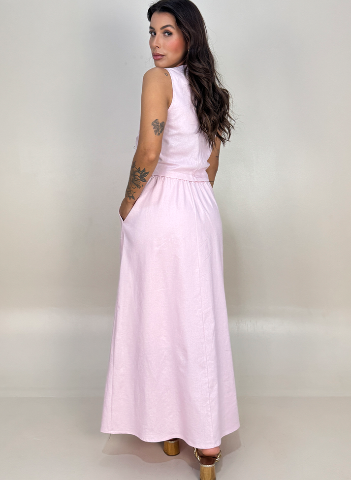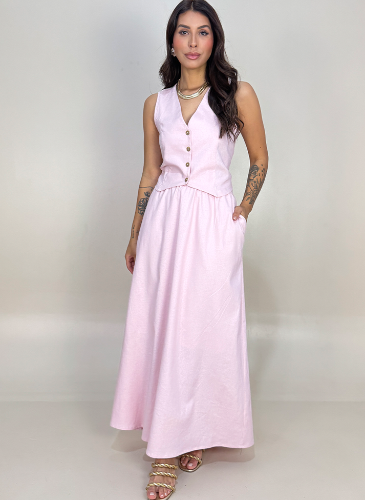 Conjunto em linho misto com elastano, tecido com boa elasticidade, aspecto rustico do linho, caimento leve e toque macio. Composto por colete e saia longa se inspira na alfaiataria feminina e traz uma leitura leve e feminina para o verão. O colete possui barra em W e corte anatômico, com decote em V tradicional e transpasse com botões. A saia longa segue corte evasê com franzido, possui bolsos faca, forro e cós em elástico nas costas proporcionando conforto e vestibilidade.
