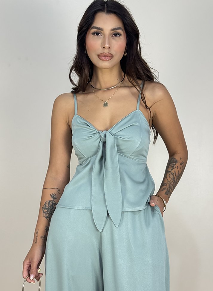 Conjunto em viscose sarjada, tecido com caimento leve e toque macio. Composto por cropped e calça pantalona o conjunto traz uma estética ultra feminina e romântica com amarração frontal no cropped, decote V e peplum. De alcinhas o cropped ainda possui reguladores e elástico nas costas trazendo maior conforto e vestibilidade. A calça pantalona possui forro, bolsos faca e cós com elástico nas costas.