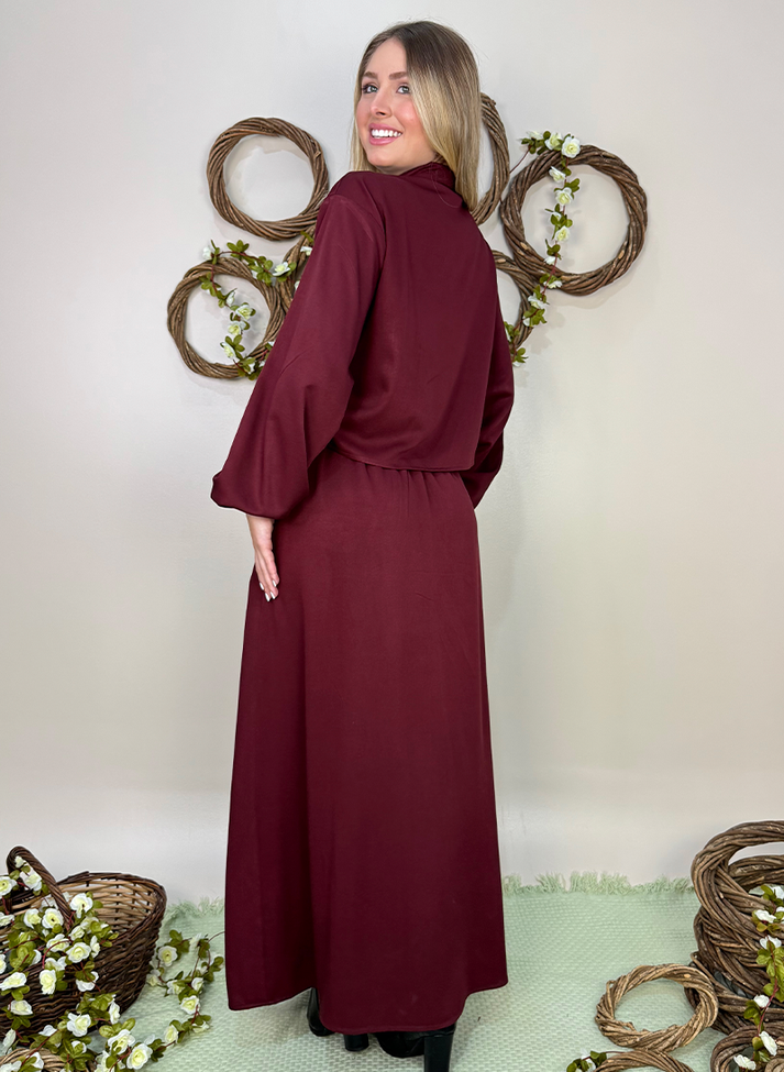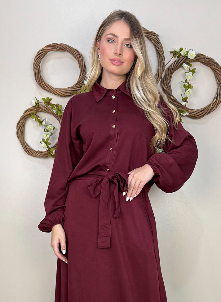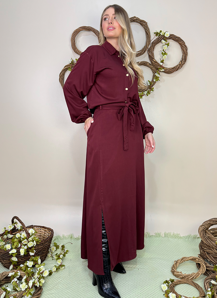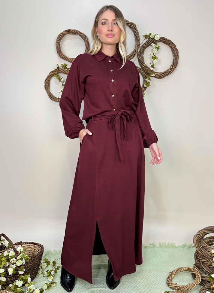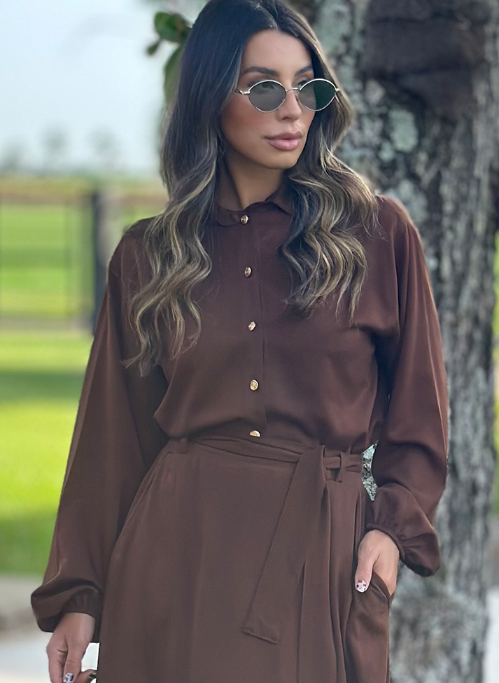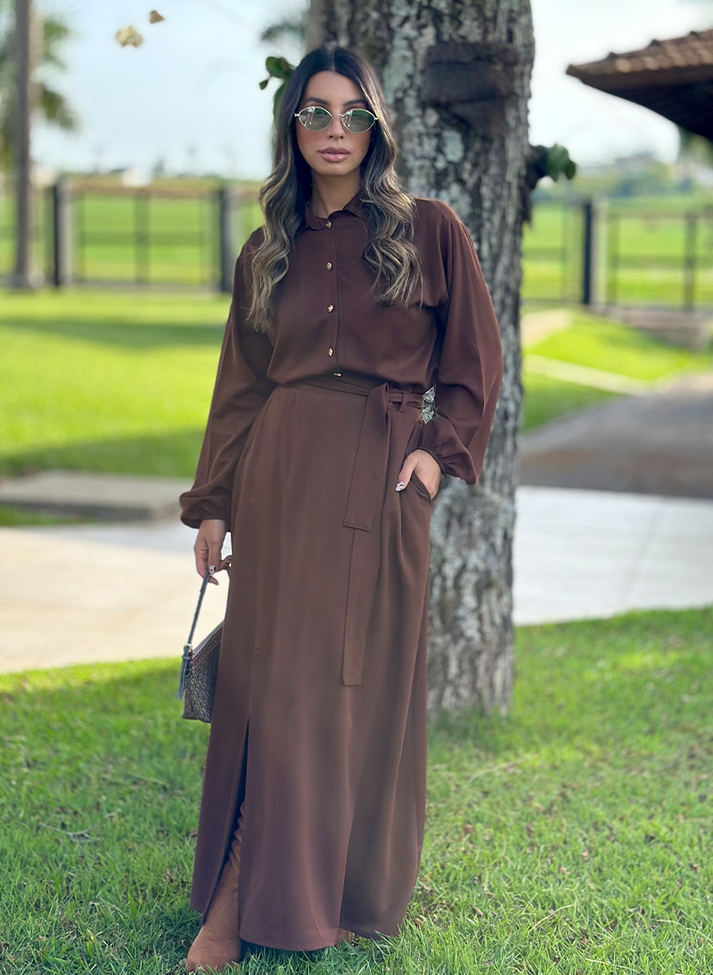 Conjunto em viscose sarjada, tecido com caimento leve e toque macio. Composto por camisa cropped e saia longa. A camisa segue modelagem oversized com cava deslocada e mangas com volume franzido no punho com elástico, um design clássico e romântico. A saia possui forro e cós em elástico nas costas proporcionando melhor vestibilidade e conforto. A modelagem em evasê e a fenda na lateral direita trazem movimento e fluidez a peça. A peça possui bolsos faca, passantes no cós e acompanha uma faixa larga.
