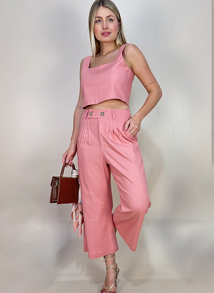 Conjunto em linho misto com elastano, tecido com aspecto rústico do linho, caimento leve e toque macio. As peças trazem uma estética cool, descontraída e moderna. O cropped com corte mais ajustado, possui alças largas e decote quadrado. A calça pantacourt com modelagem mais solta, possui abertura em braguilha, cós transpassado com botão na lateral, passantes, pregas frontais e bolsos faca.