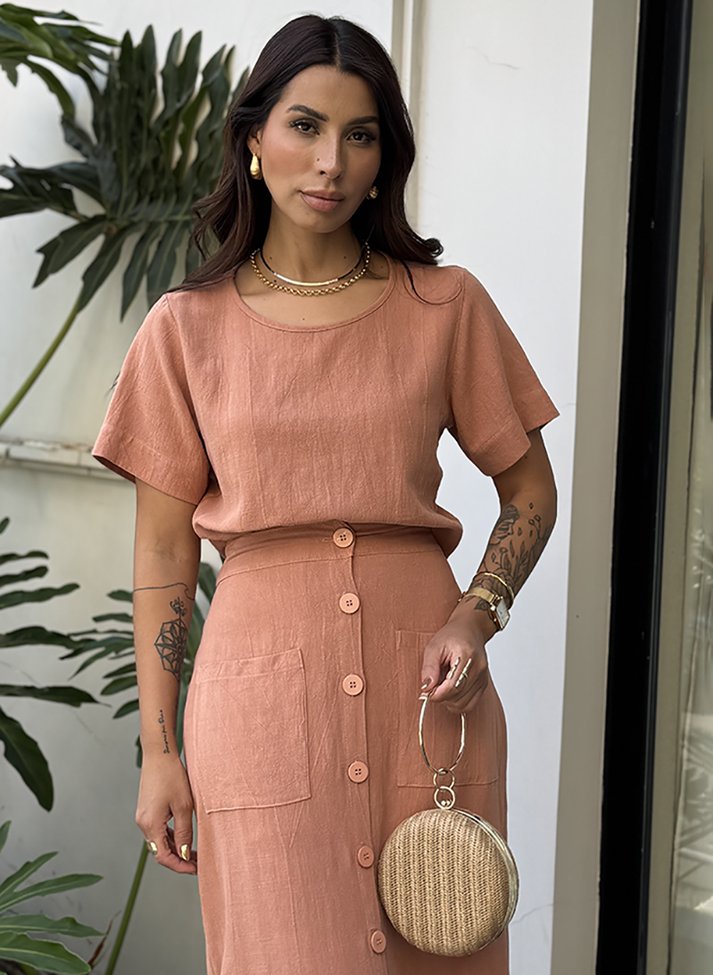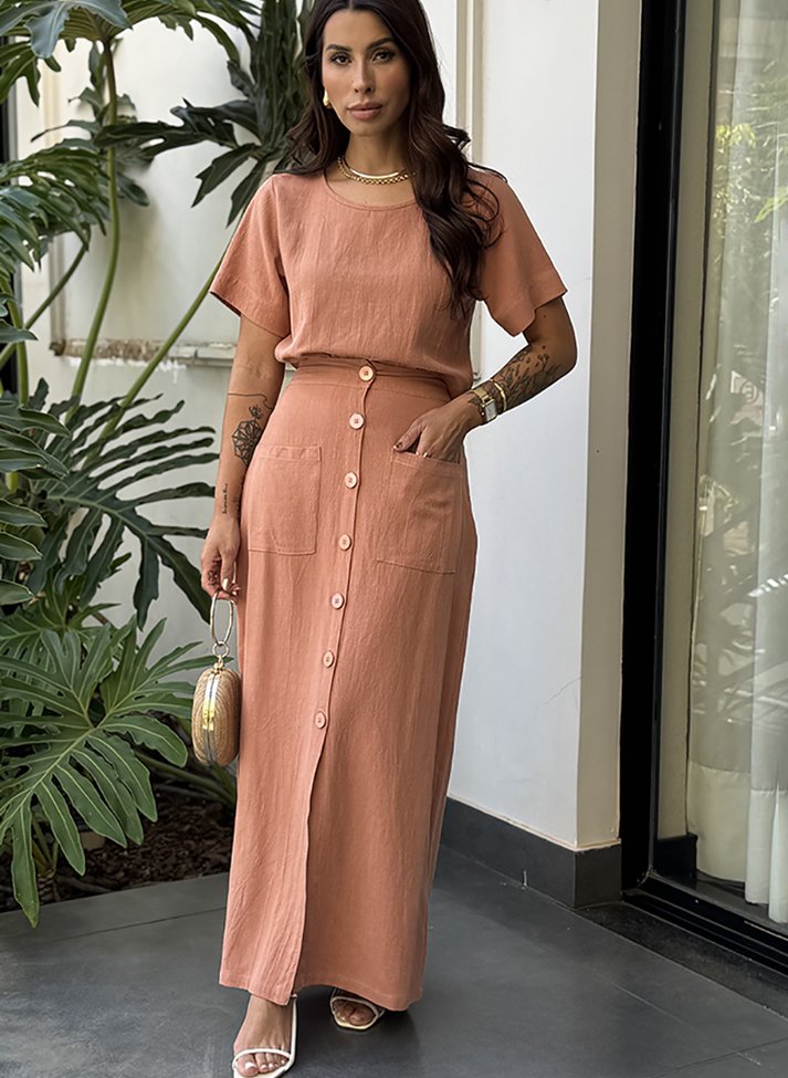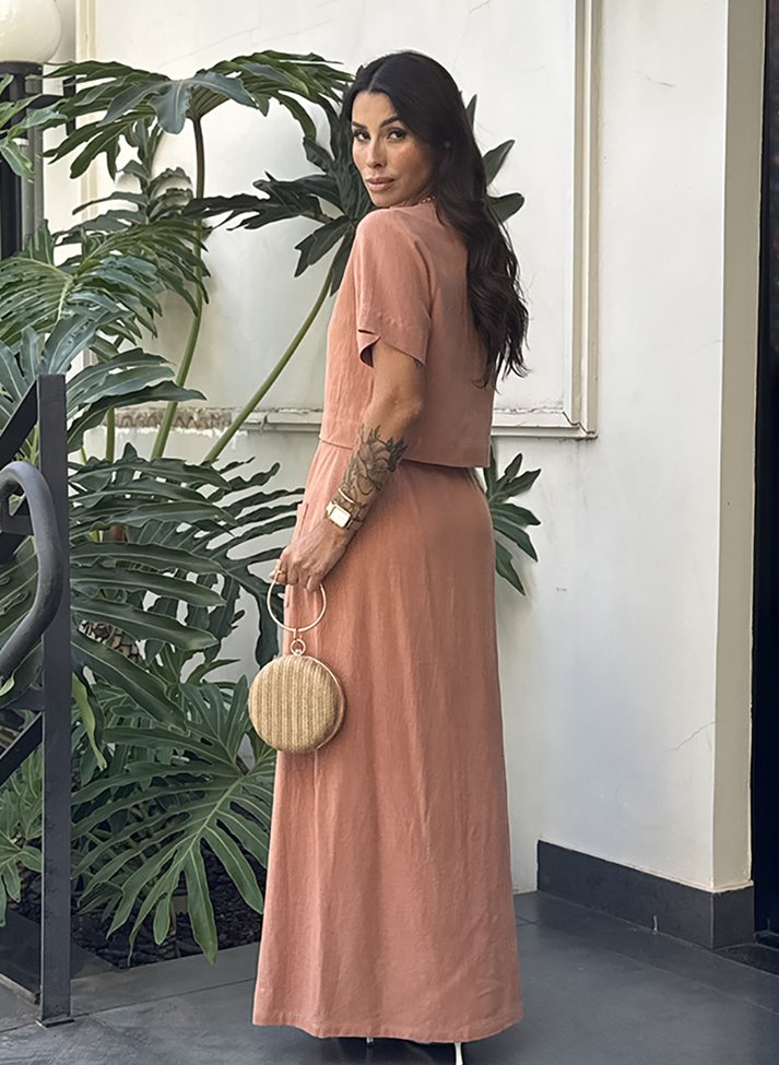 Conjunto linho misto, tecido com aspecto rústico do linho, caimento leve e toque macio da viscose. As peças evocam romantismo feminino e atemporalidade. Composto por cropped de decote canoa, com barras largas. A saia longa possui abertura frontal em vista com botões e bolsos quadrados externos frontais.