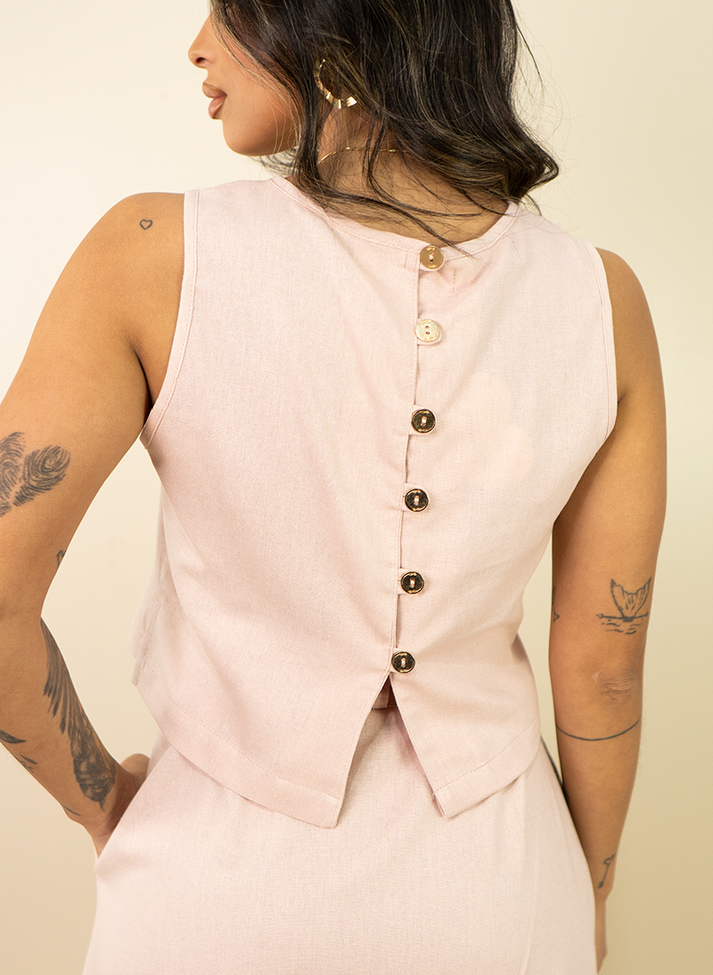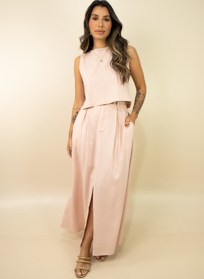 Conjunto em linho misto, tecido com aspecto rústico e caimento leve. Composto por blusa cropped e saia mídi, as peças possuem uma estética que remete a alfaiataria e ao utilitarismo moderno e romântico. Com detalhes que agregam valor e delicadeza a peça, a blusa contém decote redondo e cavas com acabamento em viés, fendas laterais pequenas e abertura nas costas em vista com casinha em argolinhas. A saia mídi possui forro, corte evasê com pregas fêmea, cós com passantes e abertura em braguilha, bolsos e fenda frontal. Acompanha um cinto fino de couro.
