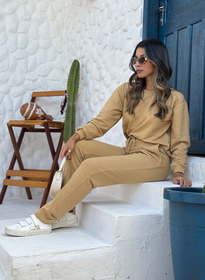 Conjunto em moletom misto de algodão, proporcionando conforto térmico. Composto por blusão e calça reta, seguem uma estética mais comfy com pegada esportiva. A blusa com modelagem mais ampla, possui gola alta e cava deslocada, trazendo um desenho mais despojado. Os punhos largos franzem a manga formando volume, trazendo um detalhe sutil e feminino.