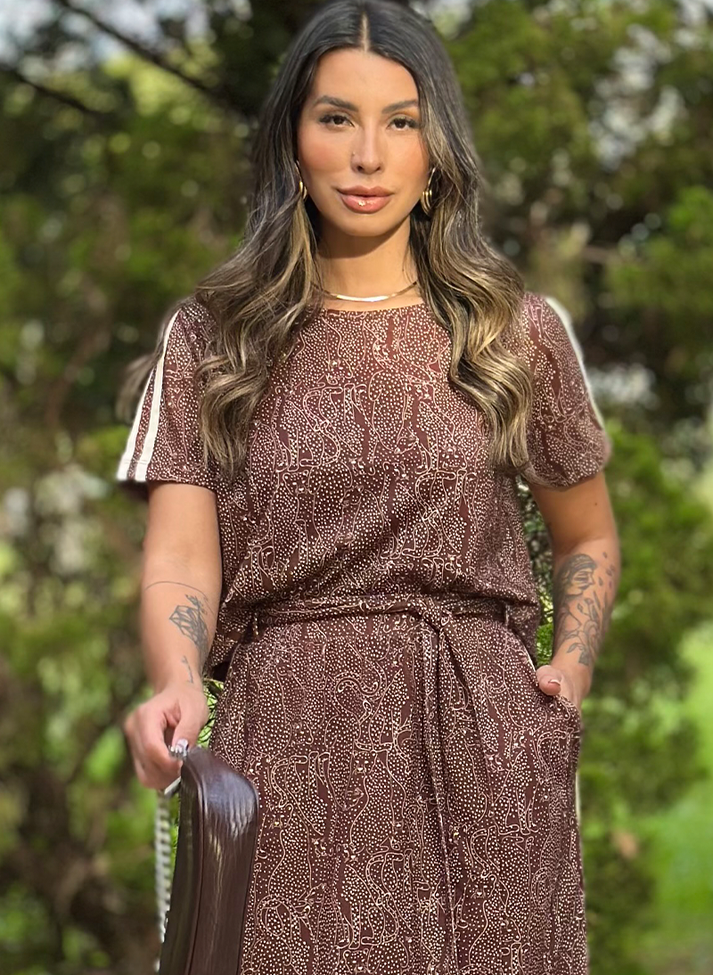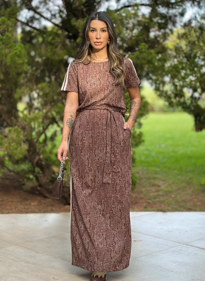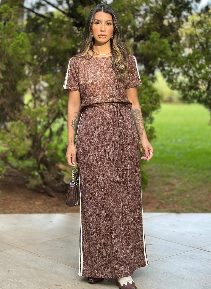 Conjunto em malha de algodão, material com conforto térmico e toque macio. Em estampa de oncinha trazendo descontração e uma estética criativa, o conjunto é composto por cropped e saia longa. O cropped com modelagem tradicional e manga curta contém decote redondo e duas faixas na manga. A saia possui cós reto com elástico embutido e forro, proporcionando melhor vestibilidade e conforto. Com passantes, bolsos faca, fenda nas costas e duas faixas laterais. Acompanha uma faixa larga avulsa.