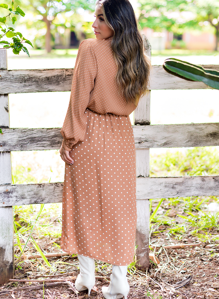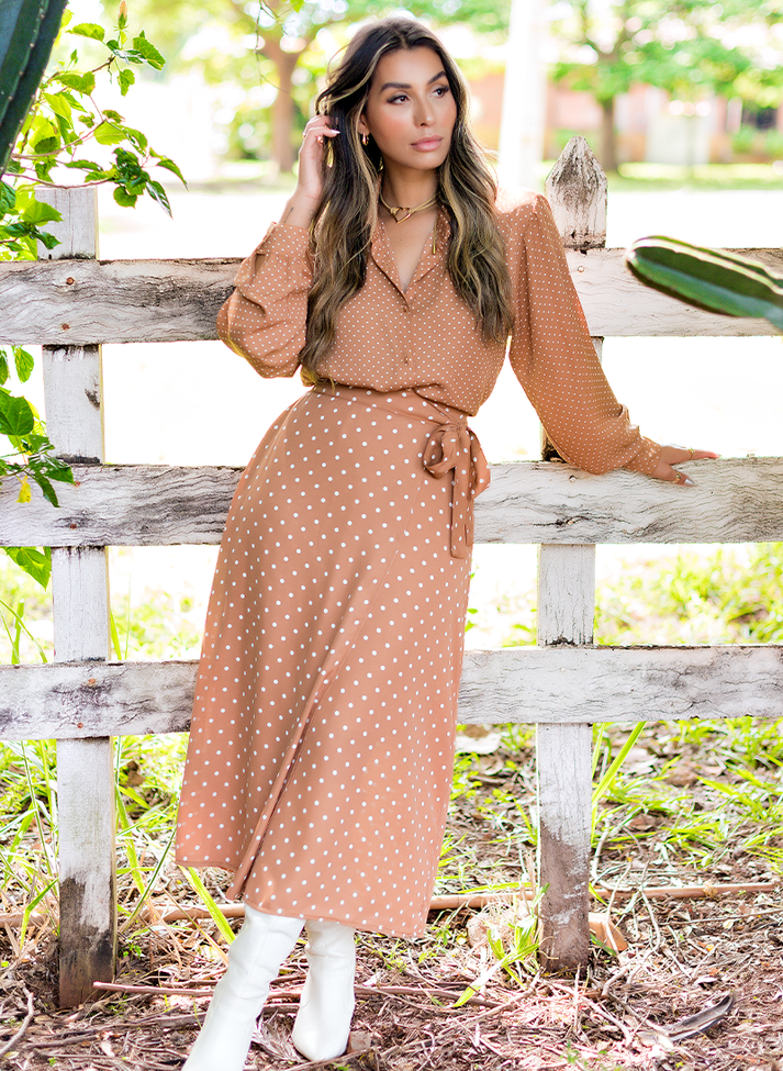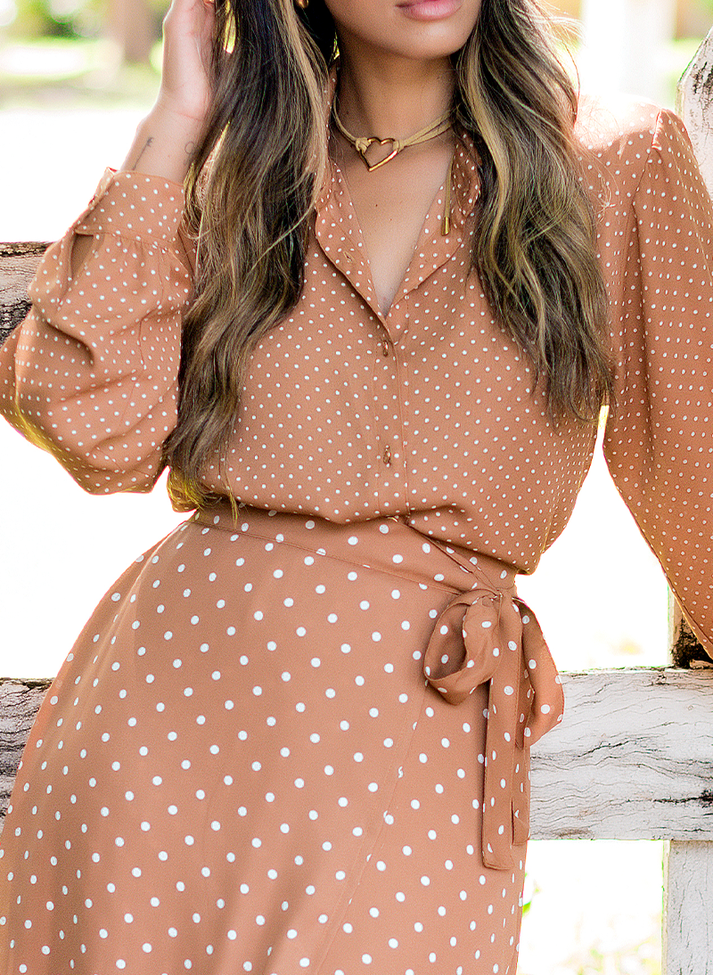 Conjunto em crepe, tecido fluido com caimento leve. Com estampa em poá, a camisa possui padronagem menor. Com modelagem levemente acinturada, colarinho tradicional e manga com punho franzido formando volume leve bufante.A saia transpassada possui forro. Com comprimento mídi, cós com elástico nas costas, proporcionando melhor vestibilidade e conforto, e transpasse frontal com amarração de faixas nas laterais, trazendo um toque delicado e feminino