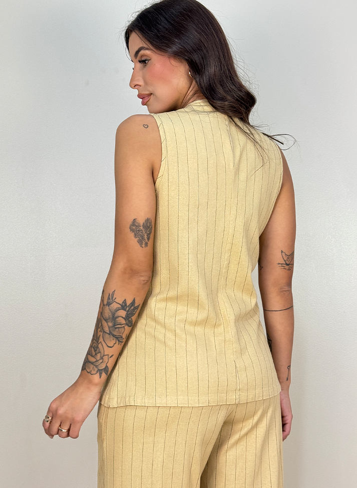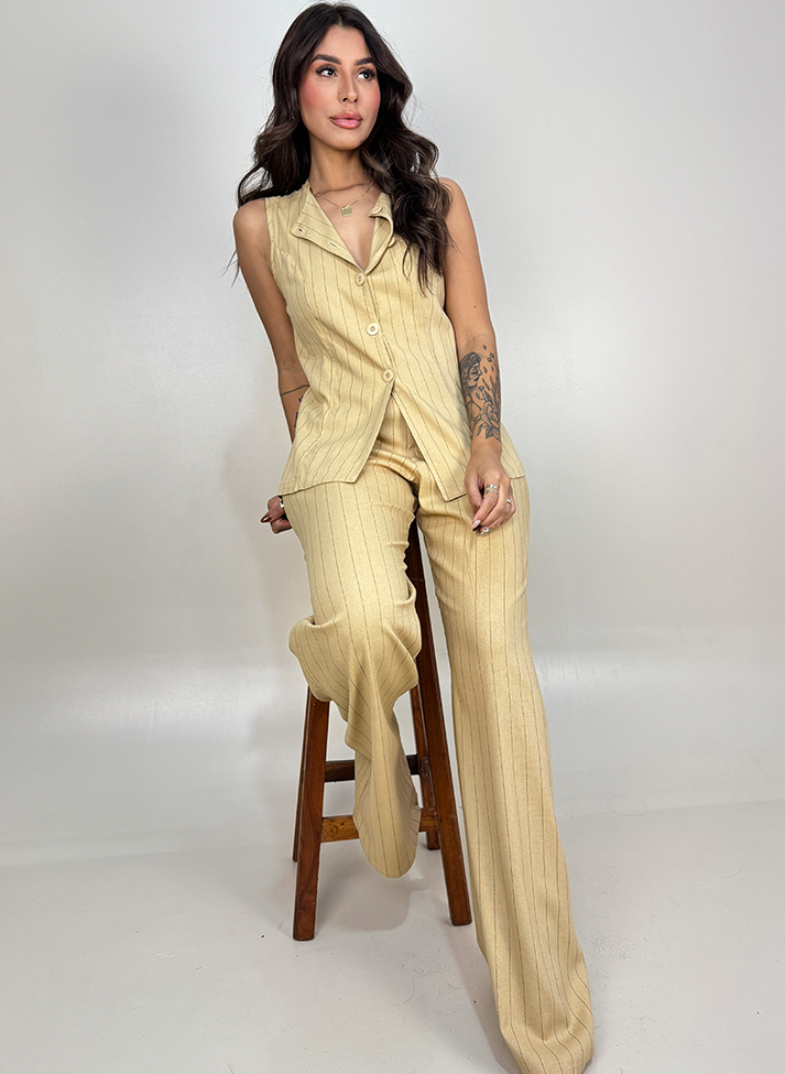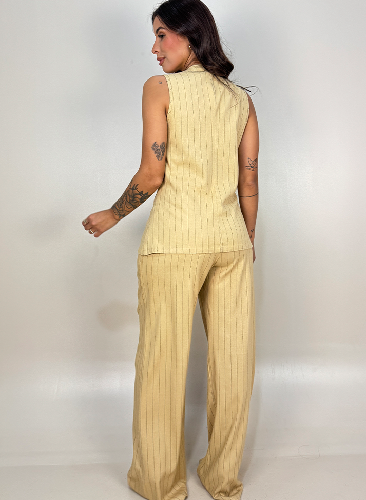 Conjunto em linho misto com elastano, tecido com elasticidade, aspecto rústico do linho, caimento leve e toque macio. Composto por colete alongado e calça pantalona, a estampa risca de giz e a modelagem conferem as peças uma estética clássica e sofisticada inspirada na alfaiataria feminina. O colete alongado com corte levemente acinturado, possui decote redondo, recorte em linha princesa, transpasse com cinco botões e acabamento em viés nas cavas. A calça em corte pantalona, contém abertura em braguilha, passantes e bolsos faca.
