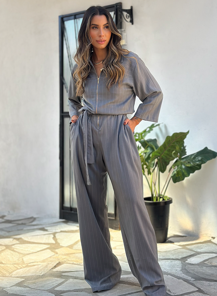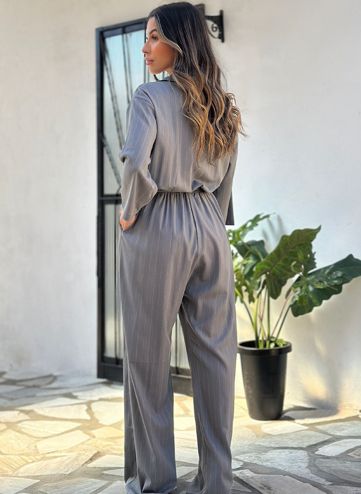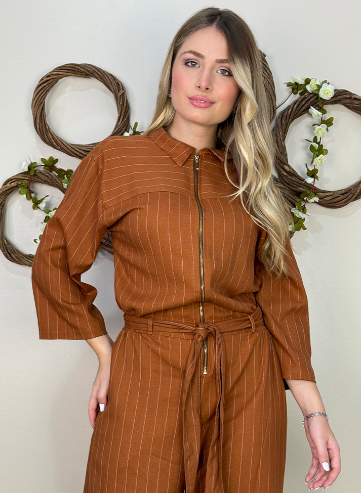 Macacão em linho misto com risca de giz. Tecido com aspecto rústico, elasticidade, caimento leve e toque macio. Sua estampa atemporal remete ao estilo clássico e a alfaiataria. Rico em detalhes é uma peça ideal para montar looks mais estilosos com pegada cool e moderna.