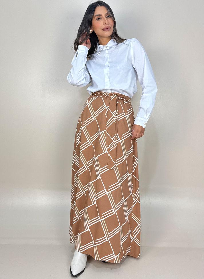 Saia em viscose estampada com padrão geométrico bicolor. Tecido com caimento leve e toque macio. A estampa traz feminilidade e um toque de modernismo, gerando um ponto de cor na hora de montar o look, trazendo a alegria do verão. A peça segue modelagem evasê, cós, passantes e abertura em zíper na lateral. Possui forro e acompanha uma faixa larga de tecido.