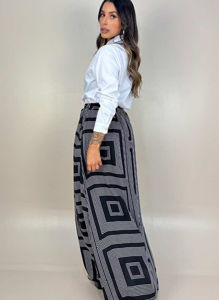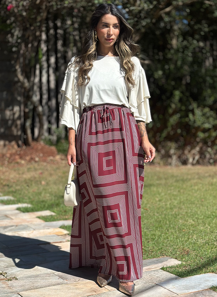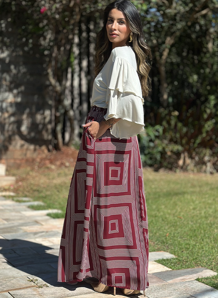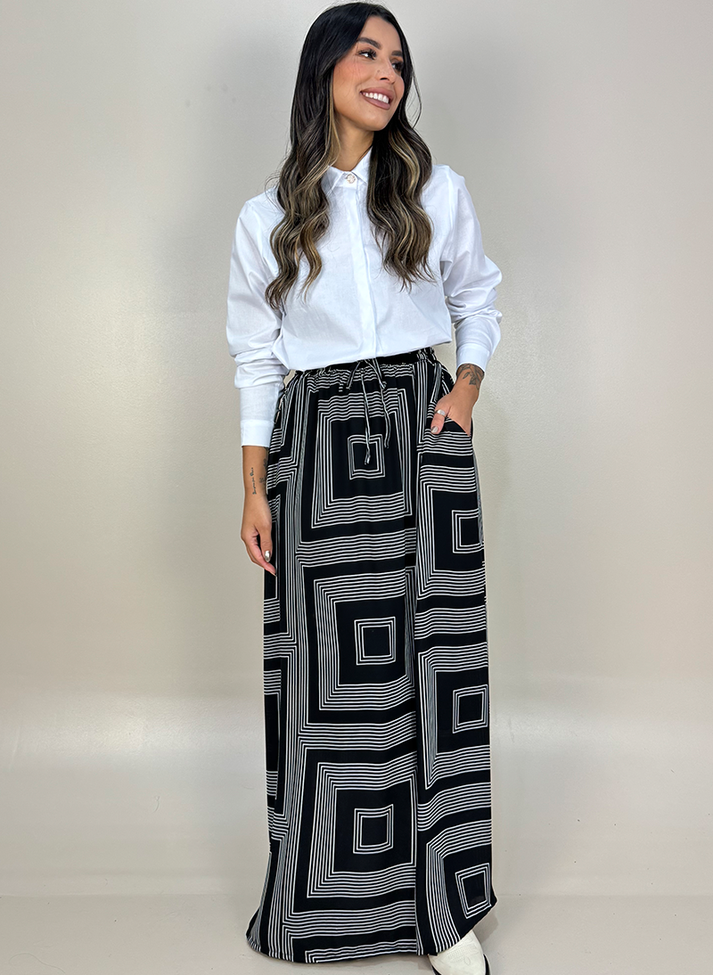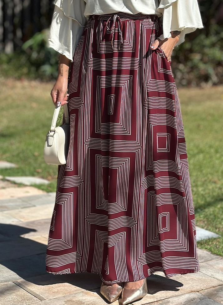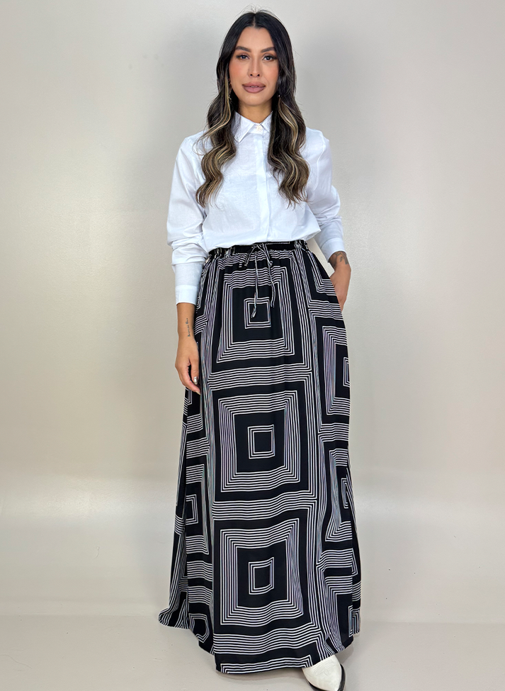 Saia Longa em estampa geométrica e tecido leve. Peça em modelagem evasê trazendo movimento. O cós em elástico e o forro proporcionam melhor vestibilidade e conforto. Possui roletê ornamental e bolsos faca. O design da peça e estampa trazem uma estética criativa e divertidas, é aquela saia ideal para ser usada como ponto de cor em looks mais sóbrios, formando uma combinação perfeita com cores neutras.