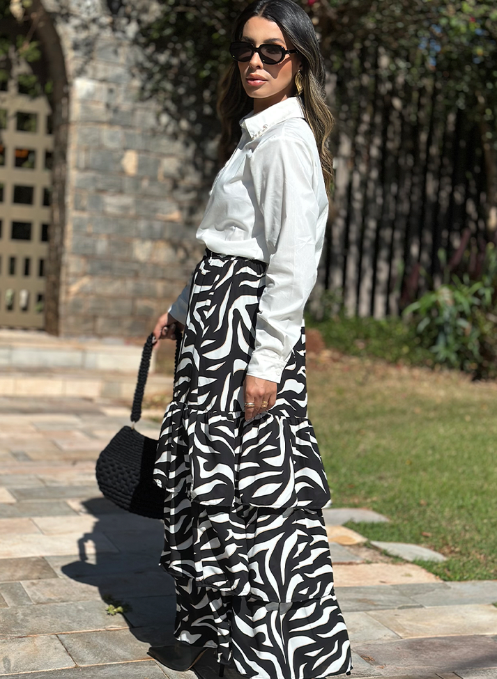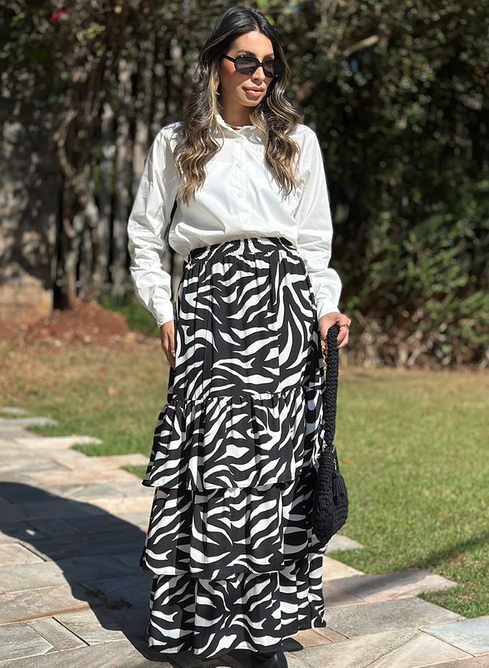Saia longa em crepe com estampa de zebra, tecido fluido com caimento leve e movimento. A saia traz um design romântico, descontraído e criativo com sobreposição de três babados abaixo da linha do quadril, criando movimento e leveza. O cos em elástico e o forro proporcionam melhor vestibilidade e conforto.