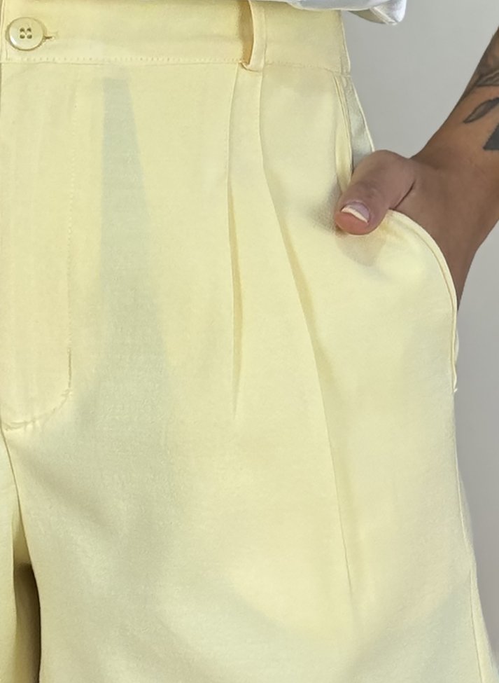 Shorts em tecido alfaiataria composto por fibras de viscose, poliéster e elastano, oferecendo boa resistência, elasticidade, caimento leve e toque macio. Com design inspirado na alfaiataria feminina possui corte mais ajustado, com abertura em braguilha, cós com passantes, bolsos faca e pregas duplas rebatidas.