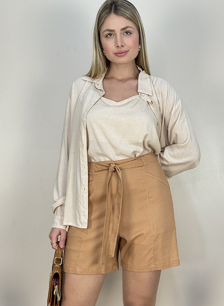Shorts em linho misto com elastano, tecido com boa elasticidade, aspecto rústico do linho, caimento leve e toque macio. O shorts possui corte evasê, recorte em linha princesa com bolsos embutidos na costura, cós com elástico nas costas e detalhe em amarração frontal. Contém forro.