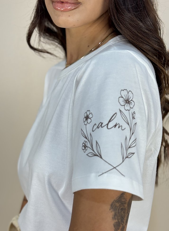 T-shirt em malha de algodão, proporcionando conforto e toque macio. A camiseta possui corte levemente acinturado, com palas nos ombros, decote redondo com ribana e recorte lateral na diagonal. A peça ainda possui uma estampa na manga esquerda, um detalhe que traz delicadeza e charme a peça.