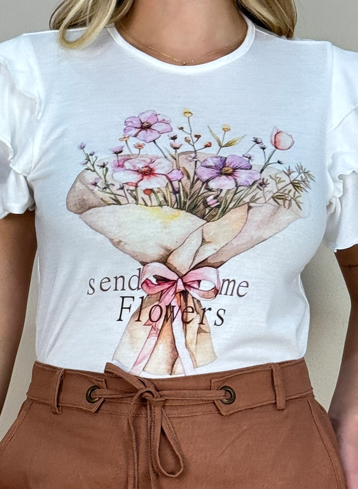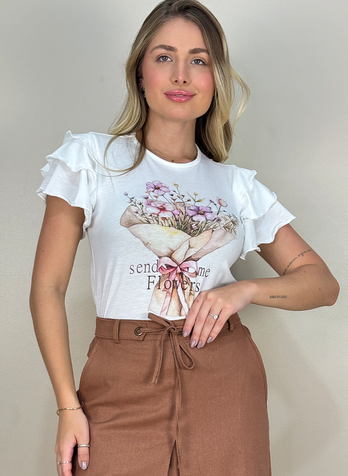T-shirt em malha de poliéster com elastano, material com ótima elasticidade, toque macio e caimento leve. Com modelagem levemente acinturada, seu design traz uma estética romântica e ultra feminina, redesenhando as T-shirts tradicionais. Com decote redondo em viés e mangas curtas formadas por sobreposição de três babados godês. Possui estampa localizada na frente.