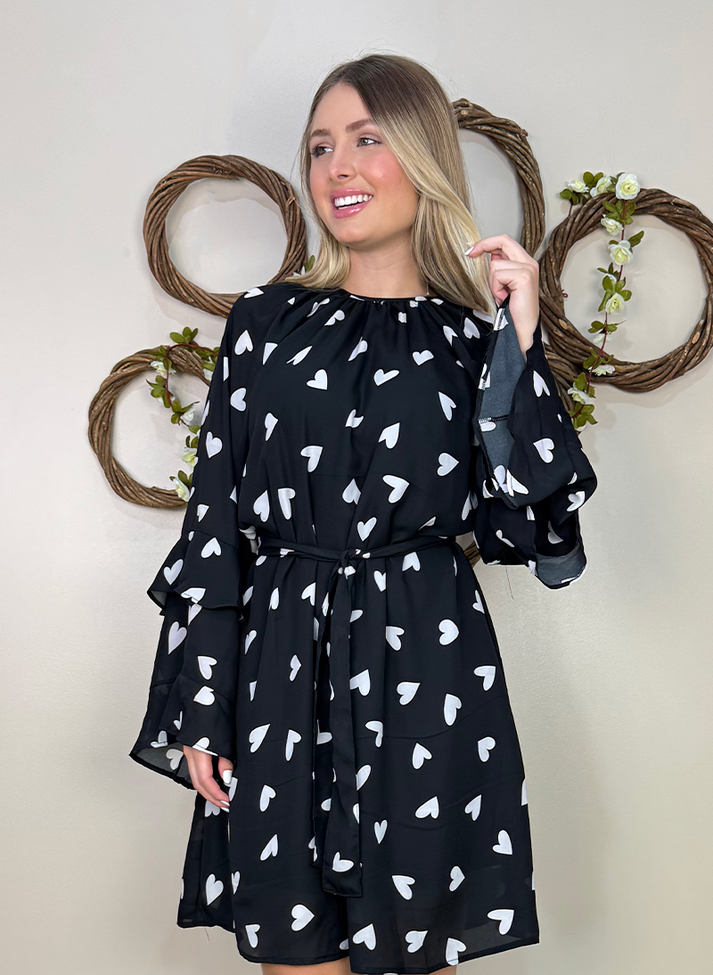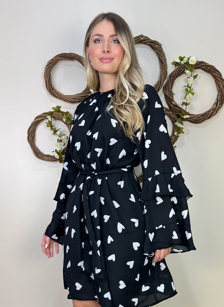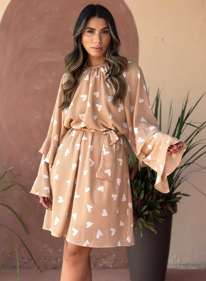 Vestido curto em crepe estampado com maxi poá de corações, tecido fluido com caimento leve e movimento. A peça tem seu design inspirado na estética boho chique, com babados e corte solto em evasê que trazem liberdade e movimento. Contém decote fechado com franzidos afunilando o volume da peça, mangas raglan em corte sino com babados e abertura em gota nas costas com botão. O vestido é forrado, trazendo melhor vestibilidade e conforto. Acompanha faixa larga avulsa.
