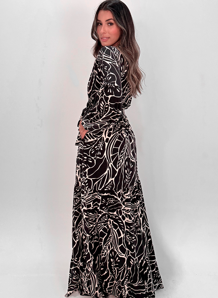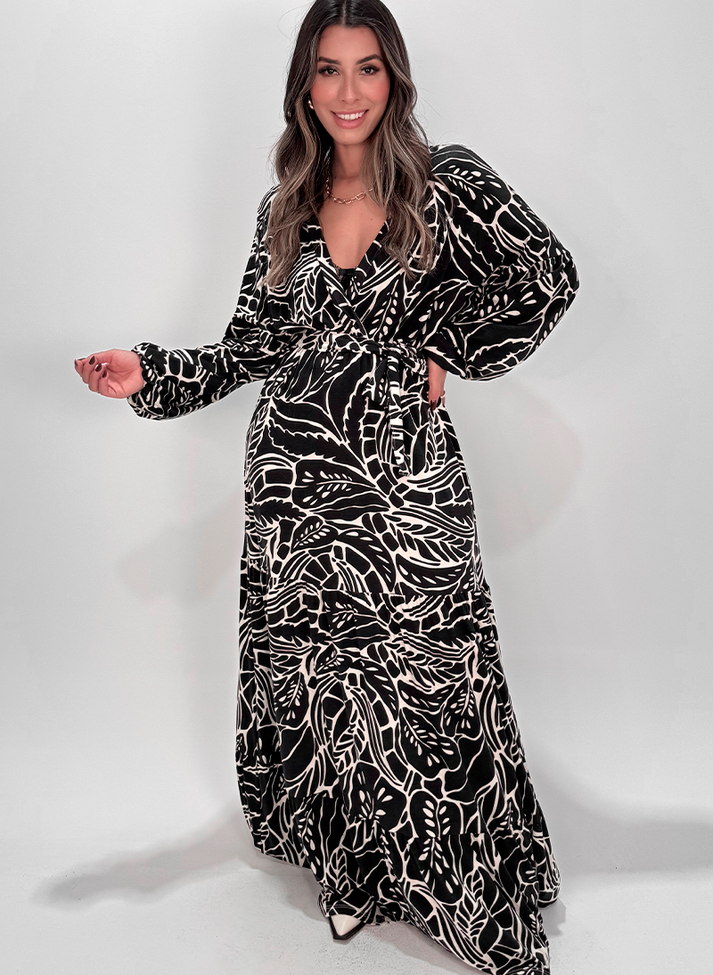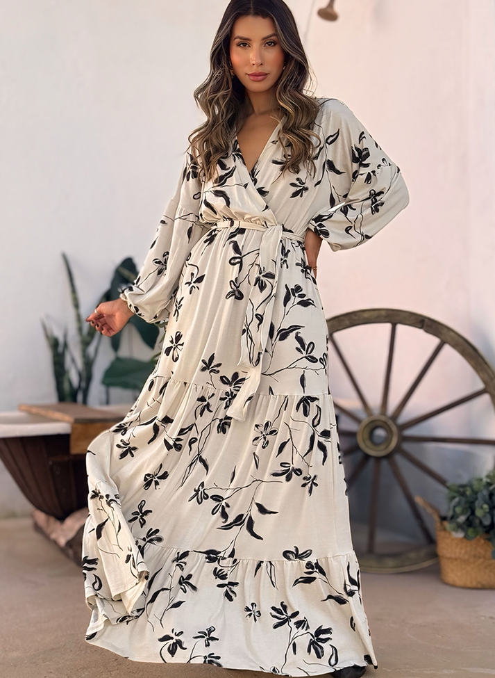 Vestido longo em malha de viscose estampada. Possui o caimento leve e toque macio. Em modelagem ampla pensada para trazer maior conforto, segue modelo transpassado falso com decote em “V” unido a recorte na cintura. Com elástico fino na cintura e passantes na lateral, acompanha uma faixa larga avulsa para amarração. A cava deslocada traz um desenho mais descontraído, com mangas longas volumosas e punho em elástico franzindo a manga. A saia segue modelo três marias com recortes franzidos gerando volume e movimento. Contém forro.