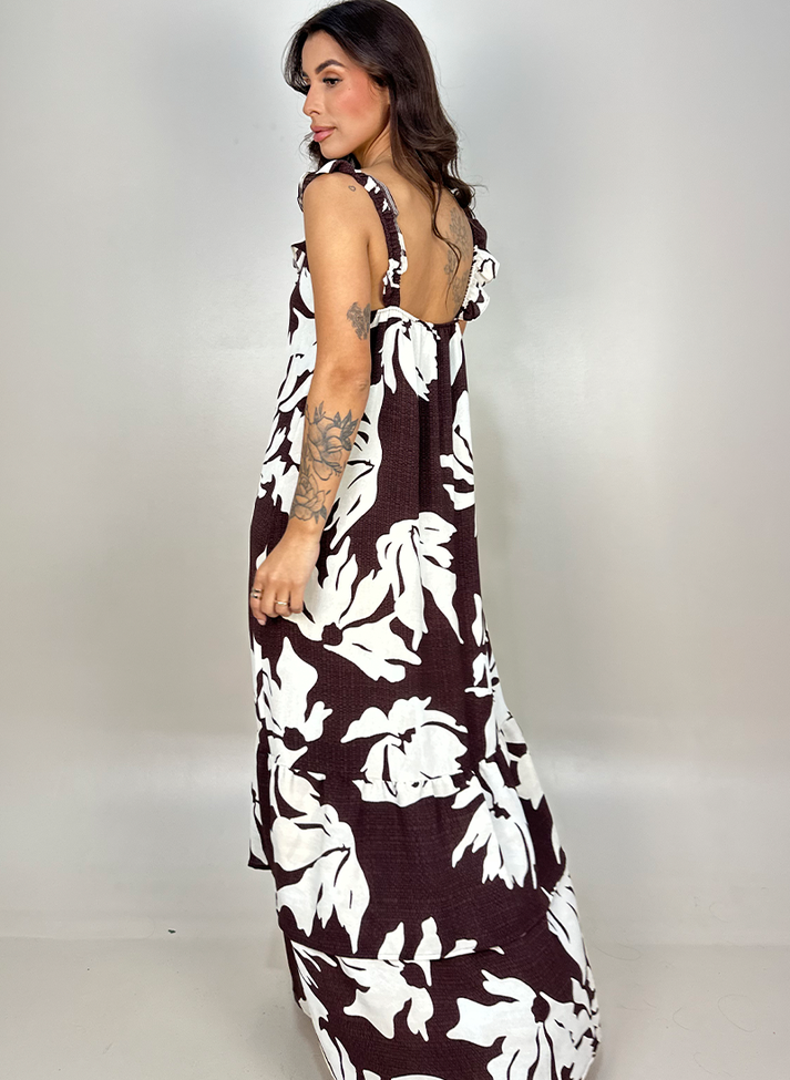 Vestido longo em crepe estampado, tecido com caimento leve e fluidez. A peça possui detalhes em babados, criando uma estética romântica e ultra Feminina. Em alças largas com elástico e aplicação de babado, contém decote em V com babado godê sobreposto, abertura em gota, e tiras finas para amarração. O corte acinturado traz um desenho em evasê a partir da cintura, finalizando a barra em babado com sobreposição de babado franzido menor. Possui forro.