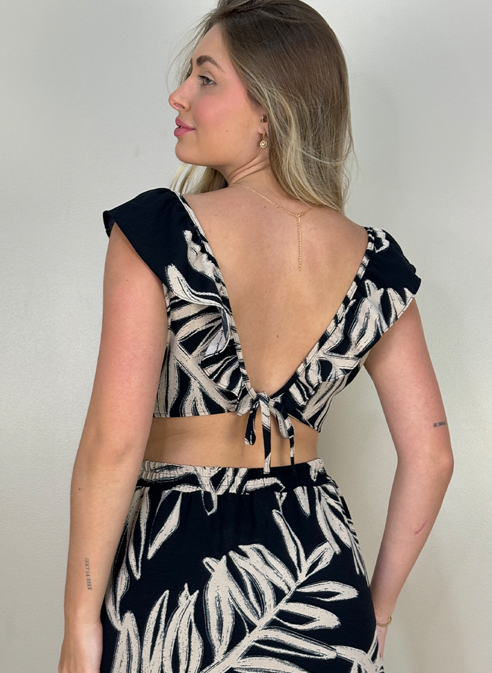 Vestido em crepe estampado com padrão de folhagens bicolor trazendo uma estética tropical, feminina e veranil. Seu corte traz uma silhueta mais ajustada até a região da cintura, soltando em evasê na saia, a aplicação de babados agrega romantismo e delicadeza a peça. Na parte superior o decote frente e costas em V possui sobreposição de babado, o vazado lateral traz uma sensualidade modesta, as costas se unem com amarração. A saia segue modelo 3 marias com aplicação de babados sobrepostos nos recortes, e se une a parte superior com cós em elástico. Contém forro.