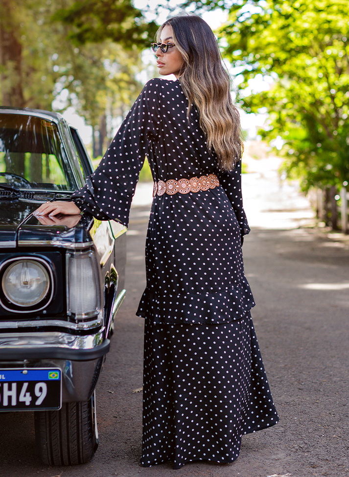 Vestido longo em crepe estampado, tecido fluido com leve transparência. Composto por viscose, possui caimento leve e toque macio. Disponível em estampa floral e poá o design do vestido segue uma estética inspirada no romantismo e no boho contemporâneo. Com modelagem mais solta trazendo uma vibe de conforto e descontração, possui aplicação de babado nas mangas e saia. Com gola simples e decote com abertura em “V” trazendo duas faixas finas para formar amarração. As mangas volumosas possuem punho em elástico, franzido e formando volume bufante. Contém forro.