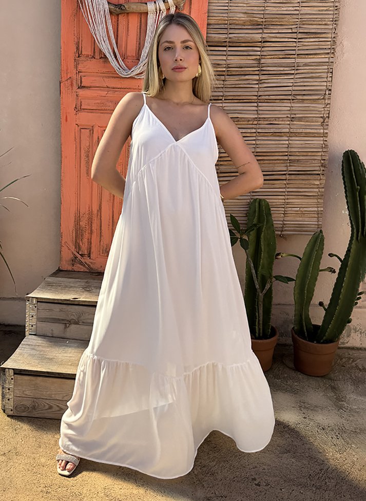 Vestido longo em crepe liso, tecido fluido com caimento leve. Com corte mais solto a peça possui a parte superior levemente ajustada com recorte em V invertido seguido por saia franzida em corte evasê com barra em babado. Possui alcinhas com regulador, decote frente e costas em V e forro.