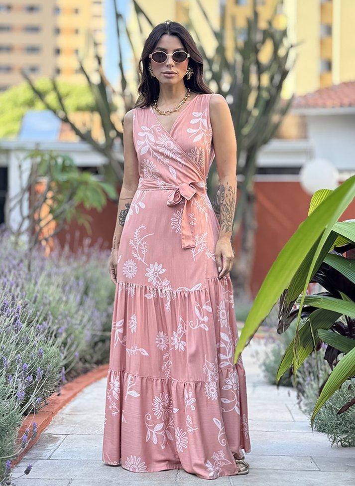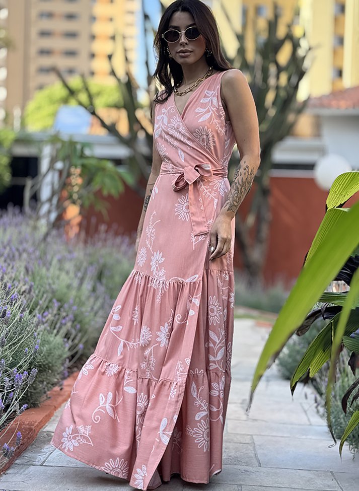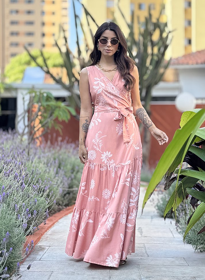 Vestido longo em viscose estampada, tecido com caimento leve e toque macio. A peça traz uma estética leve e feminina com sua estampa floral minimalista. Segue modelo transpassado com decote em V formado pelo transpasse, com faixas largas para amarração. A saia segue modelo três marias com recortes franzidos.
