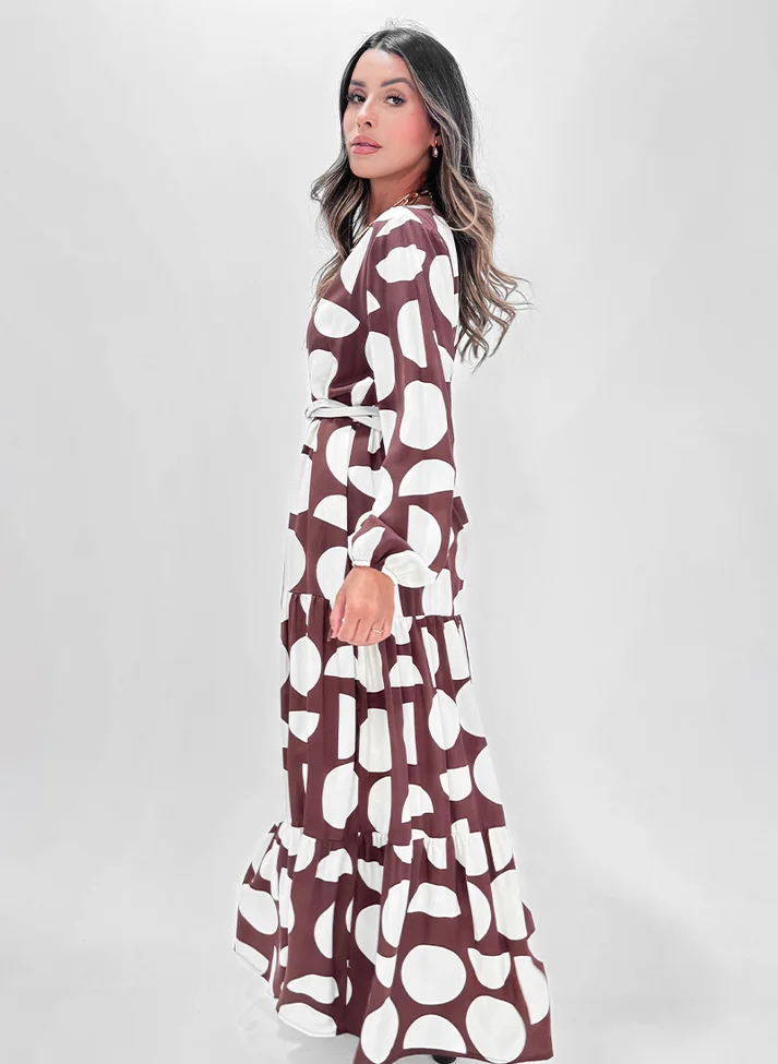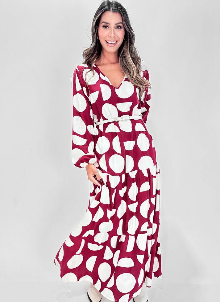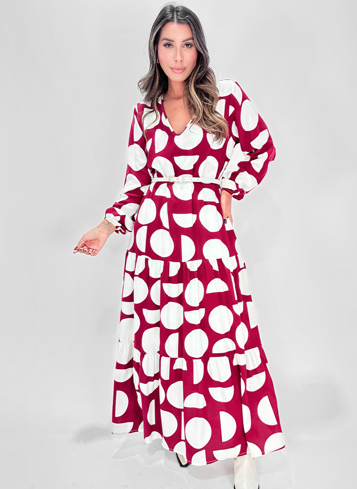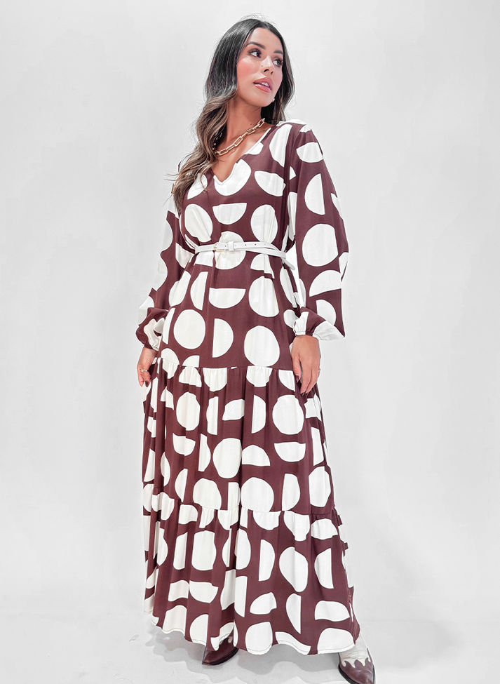 Vestido longo em viscose estampado, tecido com caimento leve e toque macio. Com modelagem mais solta, possui decote em “V”, manga longa com punho em elástico franzindo e formando volume. Contém um recorte franzido abaixo do quadril, seguido de outro que finaliza na barra formando um babado, criando volume e movimento para a peça. Possui dois passantes laterais na cintura e acompanha um cinto fino de couro. Contém forro.