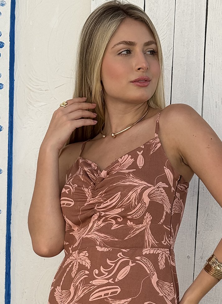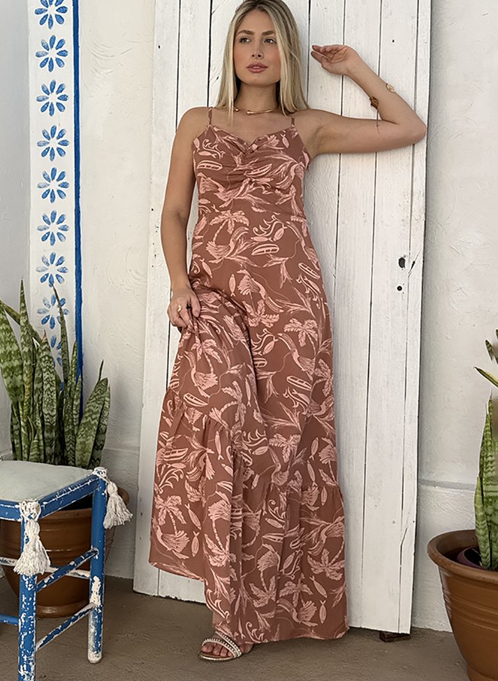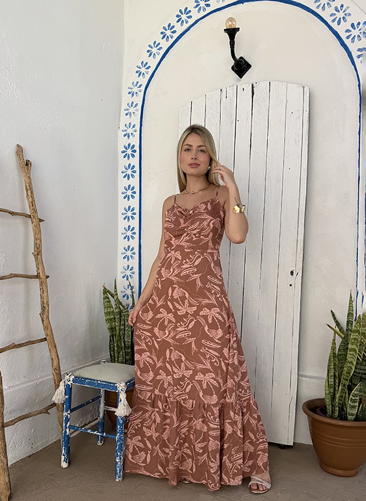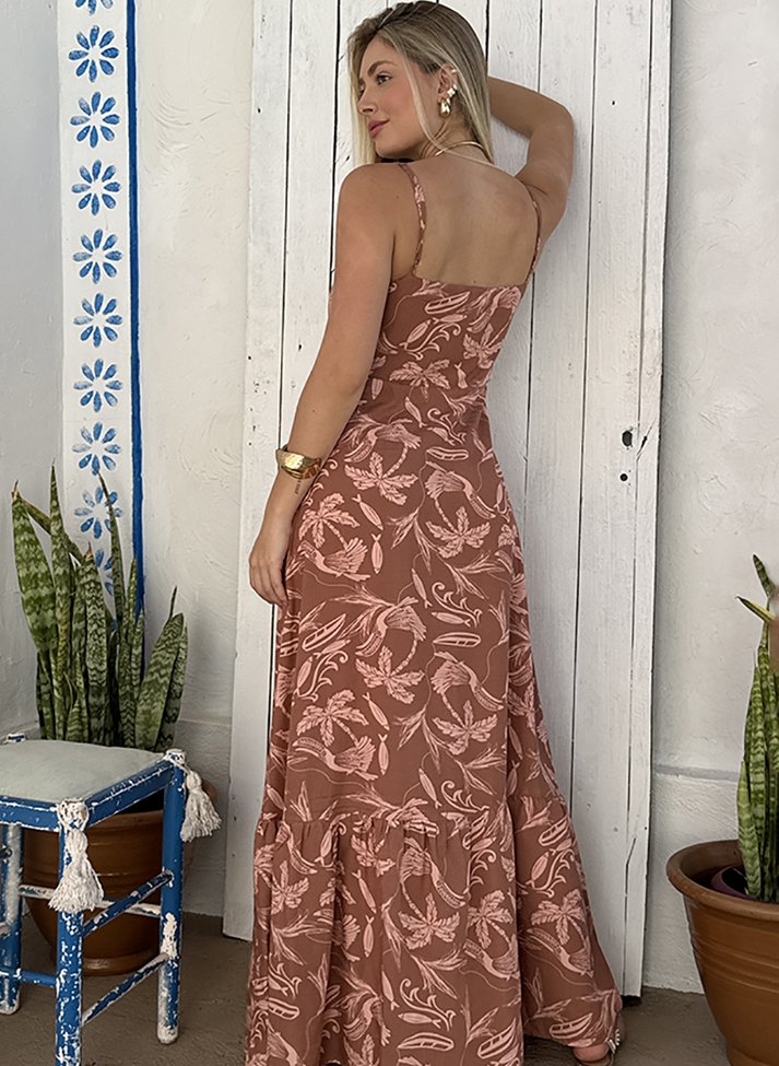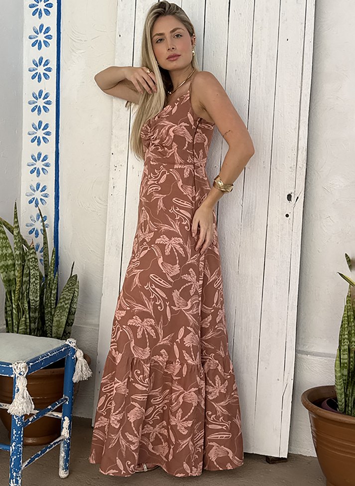 Vestido longo em viscose estampada, tecido com caimento leve e toque macio. A peça traz uma estética romântica, leve e tropical. Com corte mais ajustado até a cintura possui decote em V, alças com regulador, franzido no busto e cós frontal. A saia segue em corte evasê com barra em babado. Contém forro e abertura em zíper na lateral.