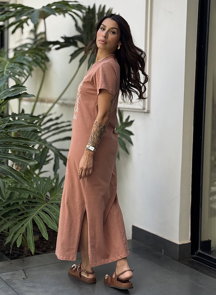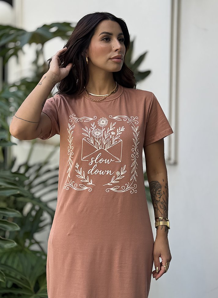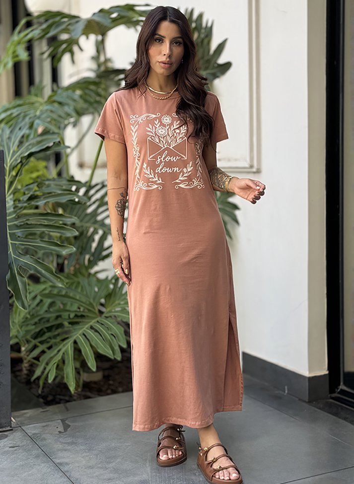 Vestido mídi em malha de algodão, proporcionando toque macio e conforto. A peça possui corte estilo camiseta, mais solto com cavas deslocadas, manga curtas, decote careca com acabamento em viés largo e fendas laterais. Possui estampa localizada frontal.