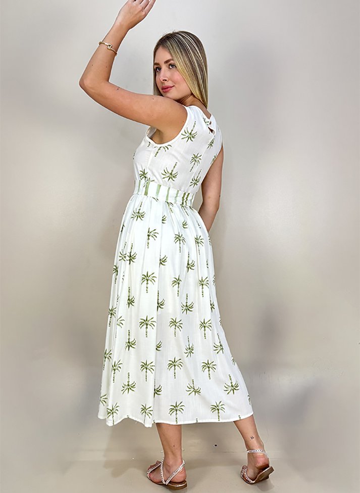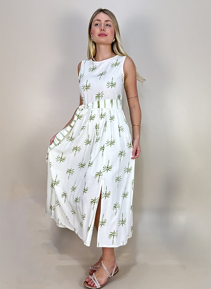 Vestido mídi em viscose estampada, tecido com caimento leve e toque macio. A estampa de coqueiros evoca a vibe tropical do verão que unida a corte do vestido trazem sofisticação. Possui a parte superior levemente ajustada com cavas e decote redondo em viés e abertura em gota nas costas. A saia do vestido segue corte evasê com pregas macho. Contém forro e acompanha uma faixa larga em estampa listrada.