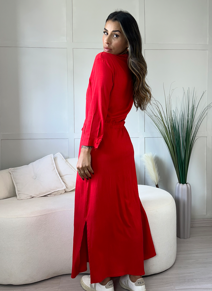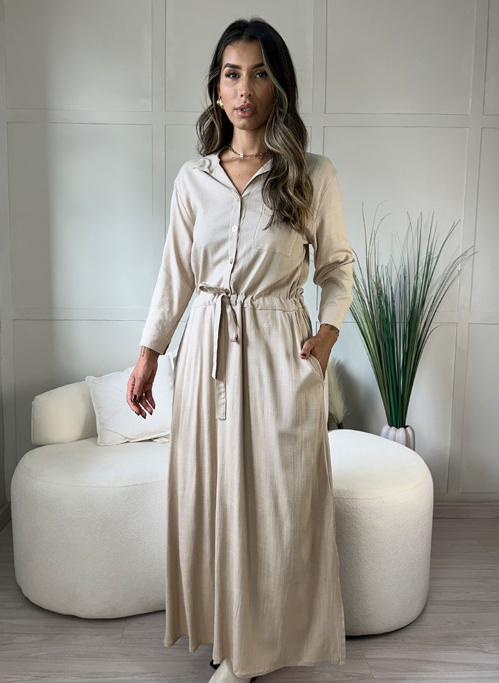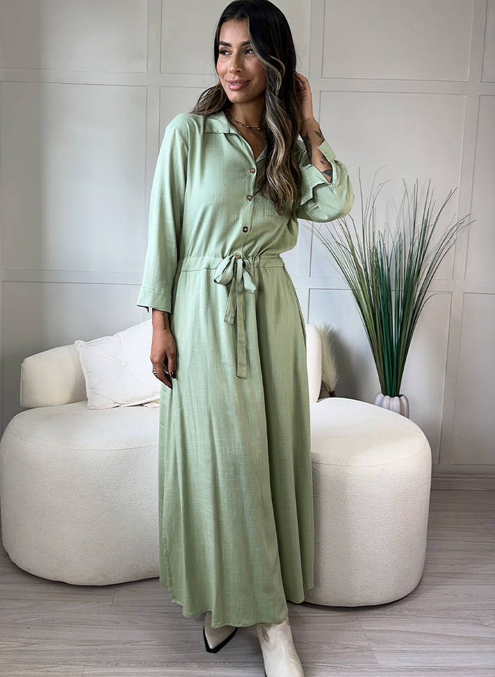 Vestido mídi em viscose com elastano, tecido de caimento leve, toque macio e elasticidade. Possui parte superior semelhante a chemise, com gola e abertura em vista com botões até a cintura. Com bolso quadrado externo e manga ¾ com punhos e botão. A cintura é marcada com uma canaleta externa, franzindo a peça, desenhando a cintura e formando amarração frontal. A saia possui modelagem evasê com fendas laterais. Possui forro.