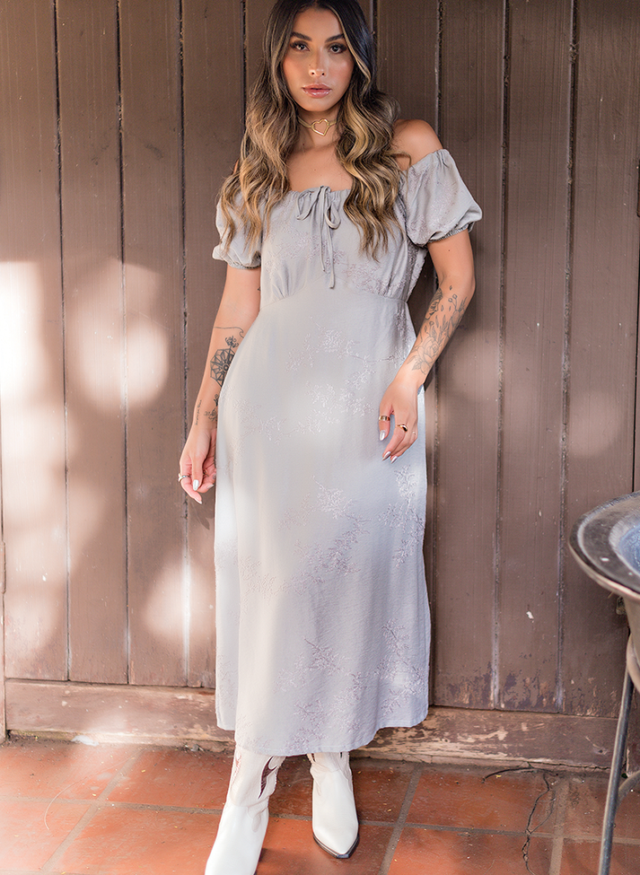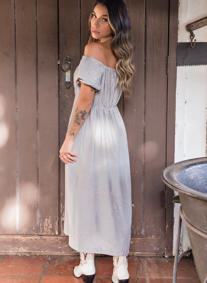 Vestido mídi em tecido de viscose bordado. Tecido com o aspecto mais rústico de fibra natural, com relevo de bordado delicado em motivos florais. A modelagem mais soltinha em ombro a ombro traz uma estética romântica e mais feminina, com recorte abaixo do busto desenhando a silhueta e manguinha bufante. Possui regulagem do decote e ombros em canaleta com amarração no centro. Contém forro.