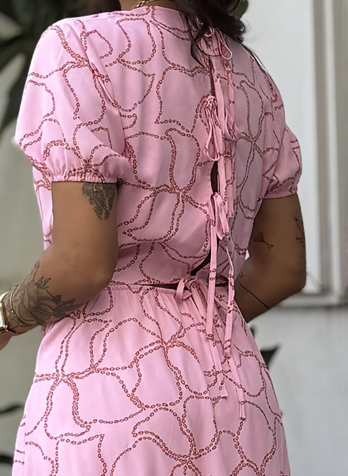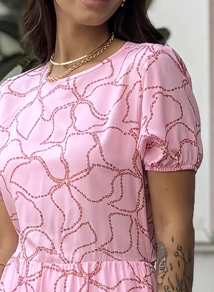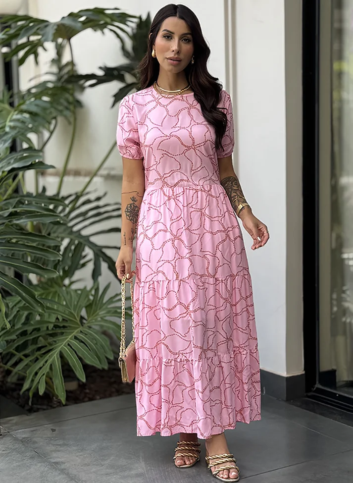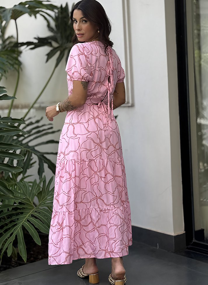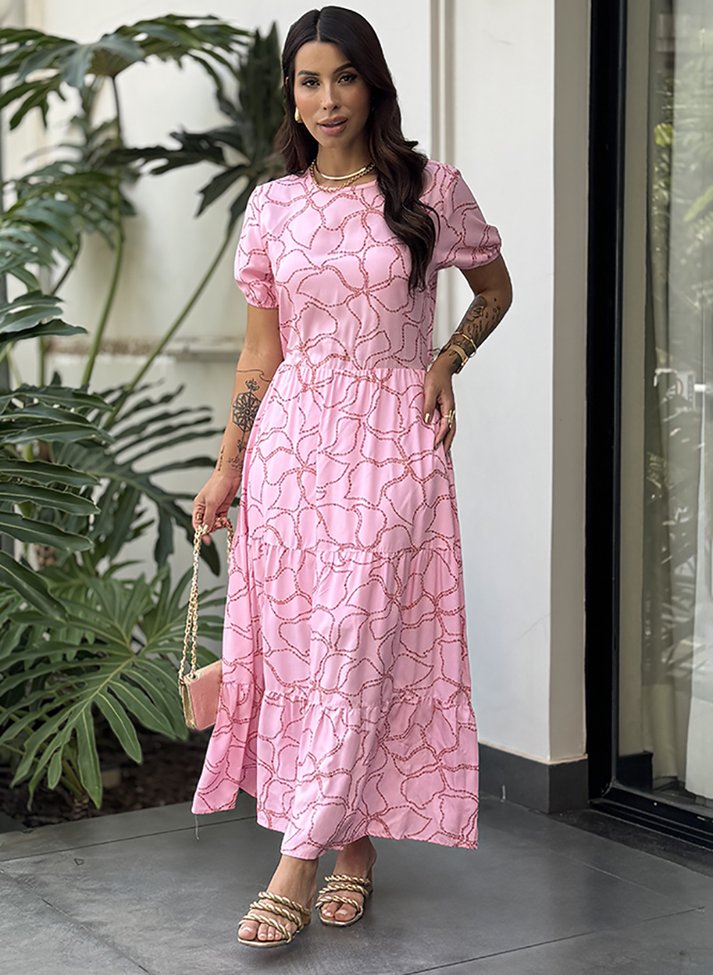 Vestido Mídi em viscose estampada, tecido com caimento leve e toque macio. A modelagem e estampa da peça evocam o clima feminino e romântico do alto verão. Com magas princesas, decote redondo, saia em modelo três Marias com recortes franzidos, e amarração as costas com tiras. Possui forro.